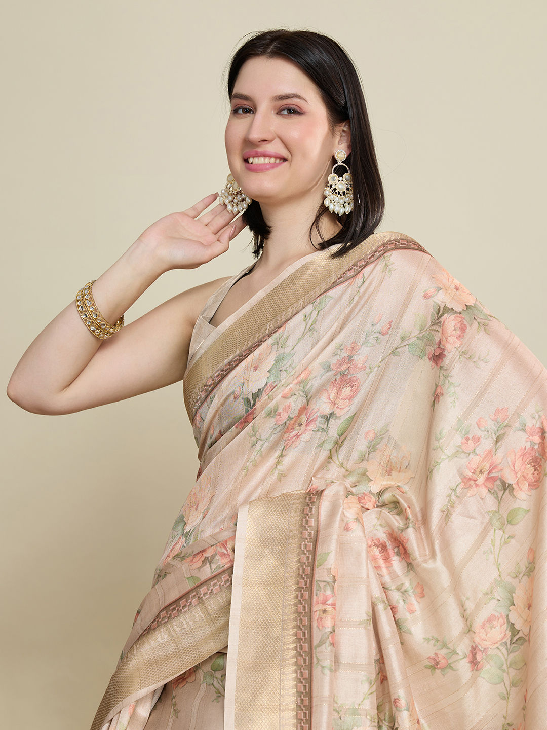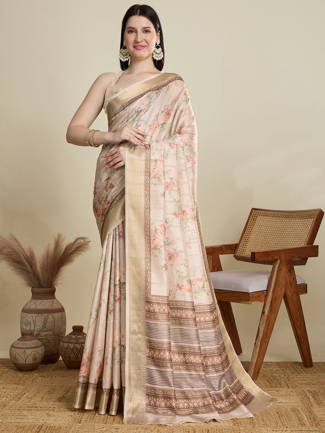 Beige and Brown color Saree in Cotton fabric with Floral, Printed, Zari work