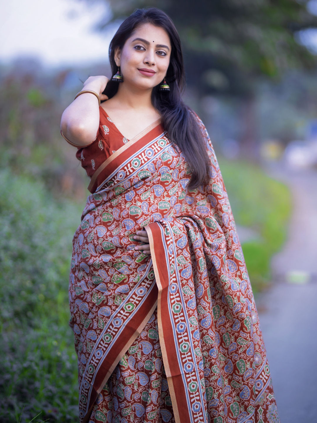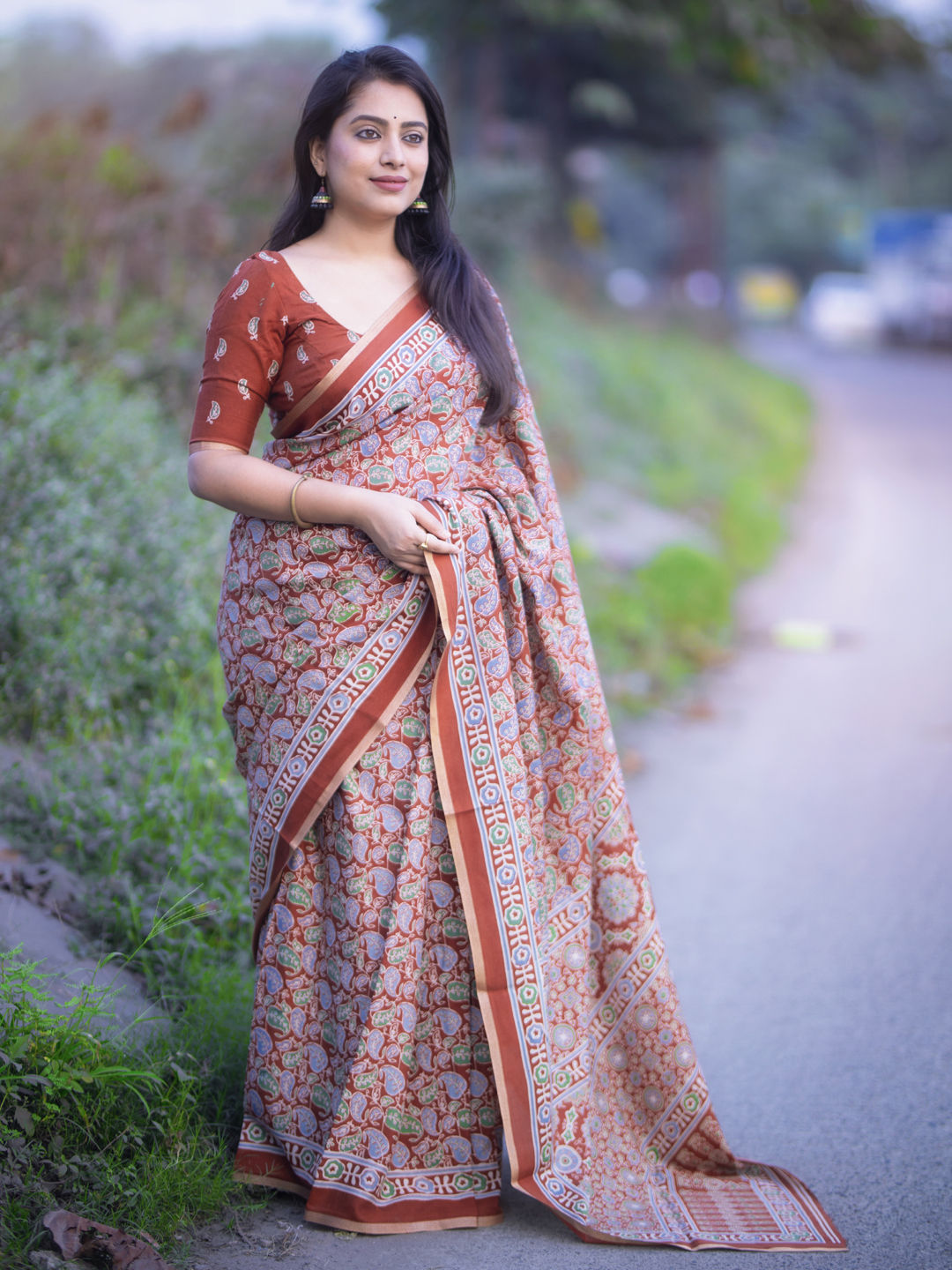 Beige and Brown color Saree in Cotton fabric with Printed work