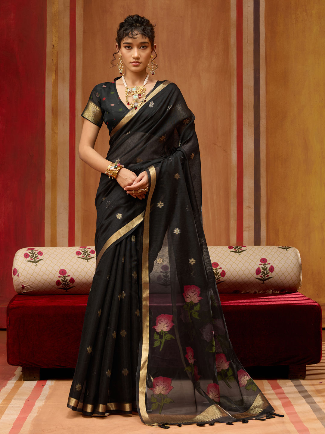 Black and Grey color Saree in Cotton fabric with Floral, Printed, Weaving work