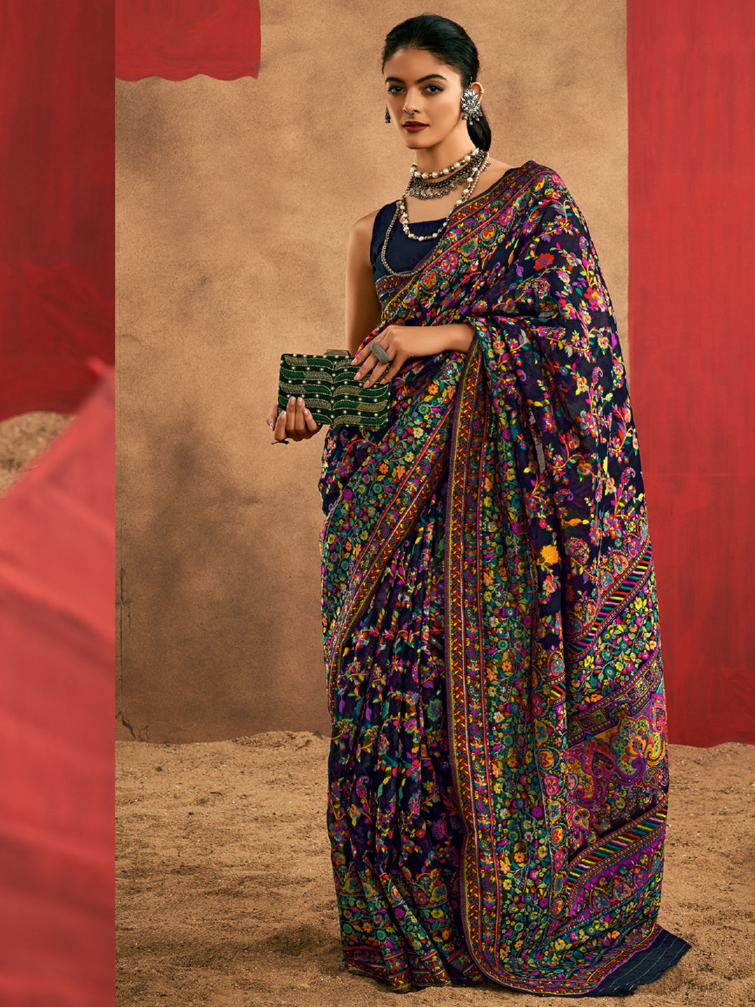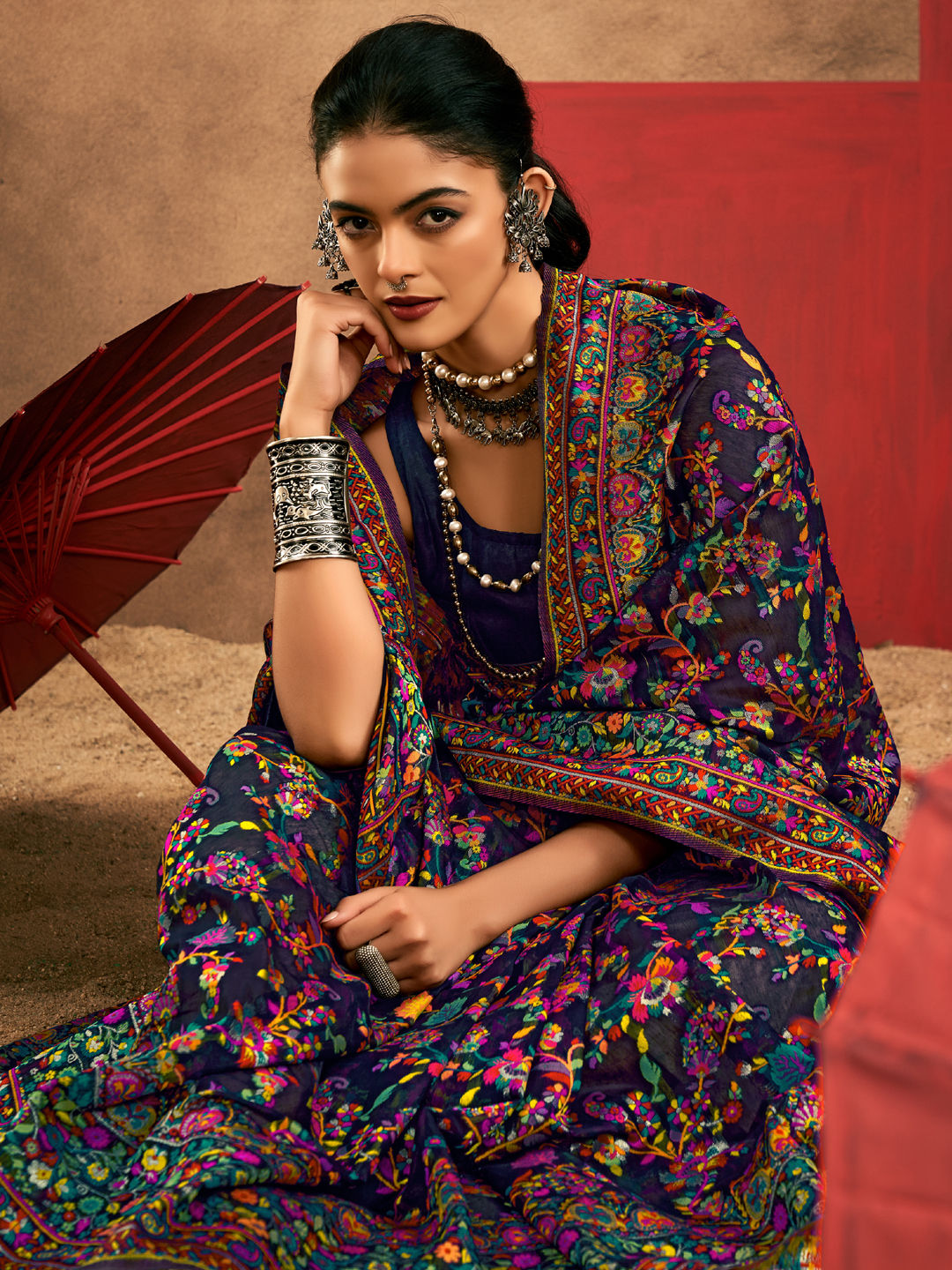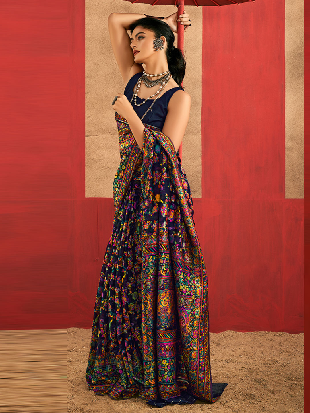 Blue color Saree in Cotton fabric with Printed, Weaving work