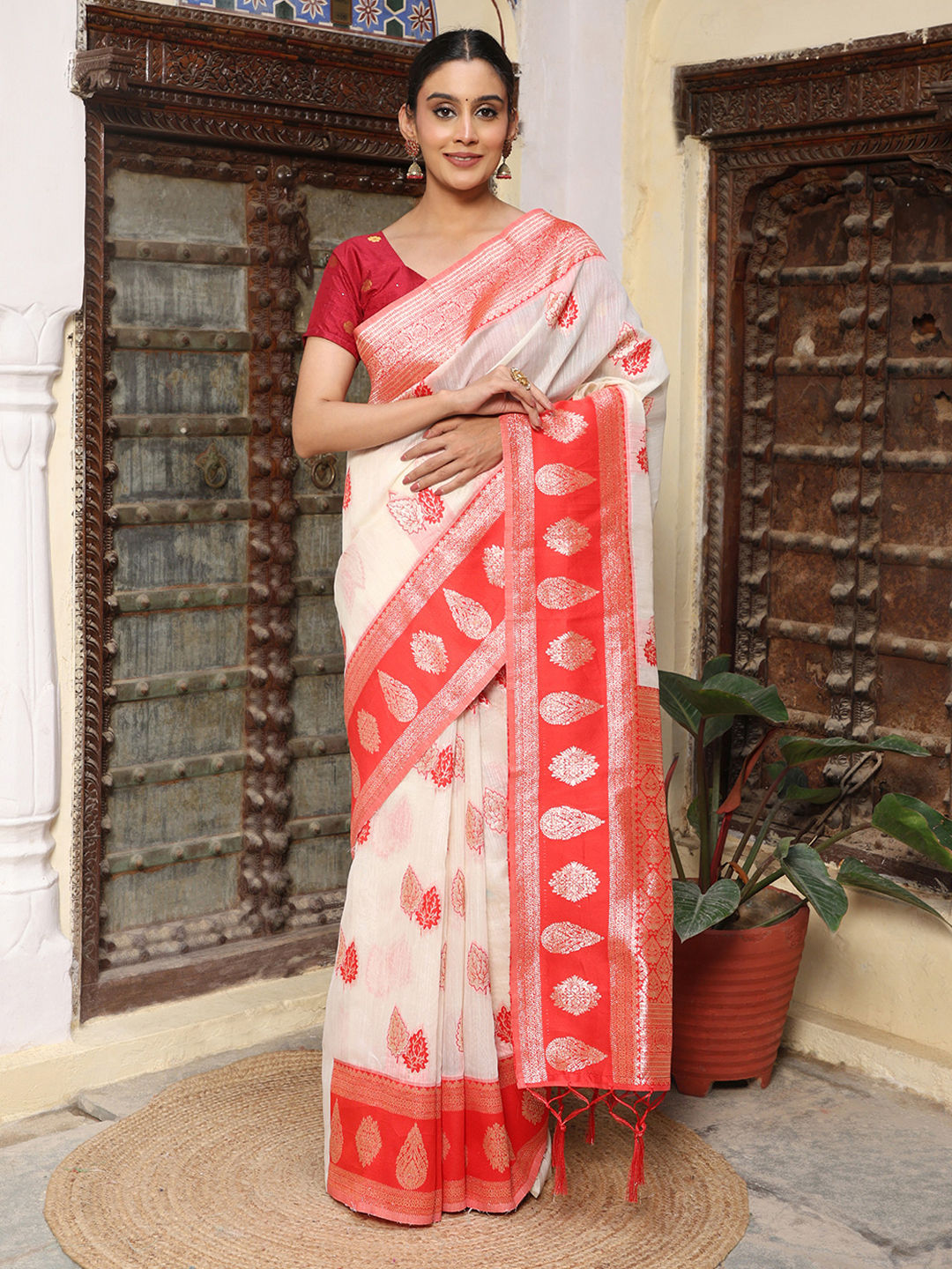 White and Off White color Saree in Cotton, Linen fabric with Weaving work