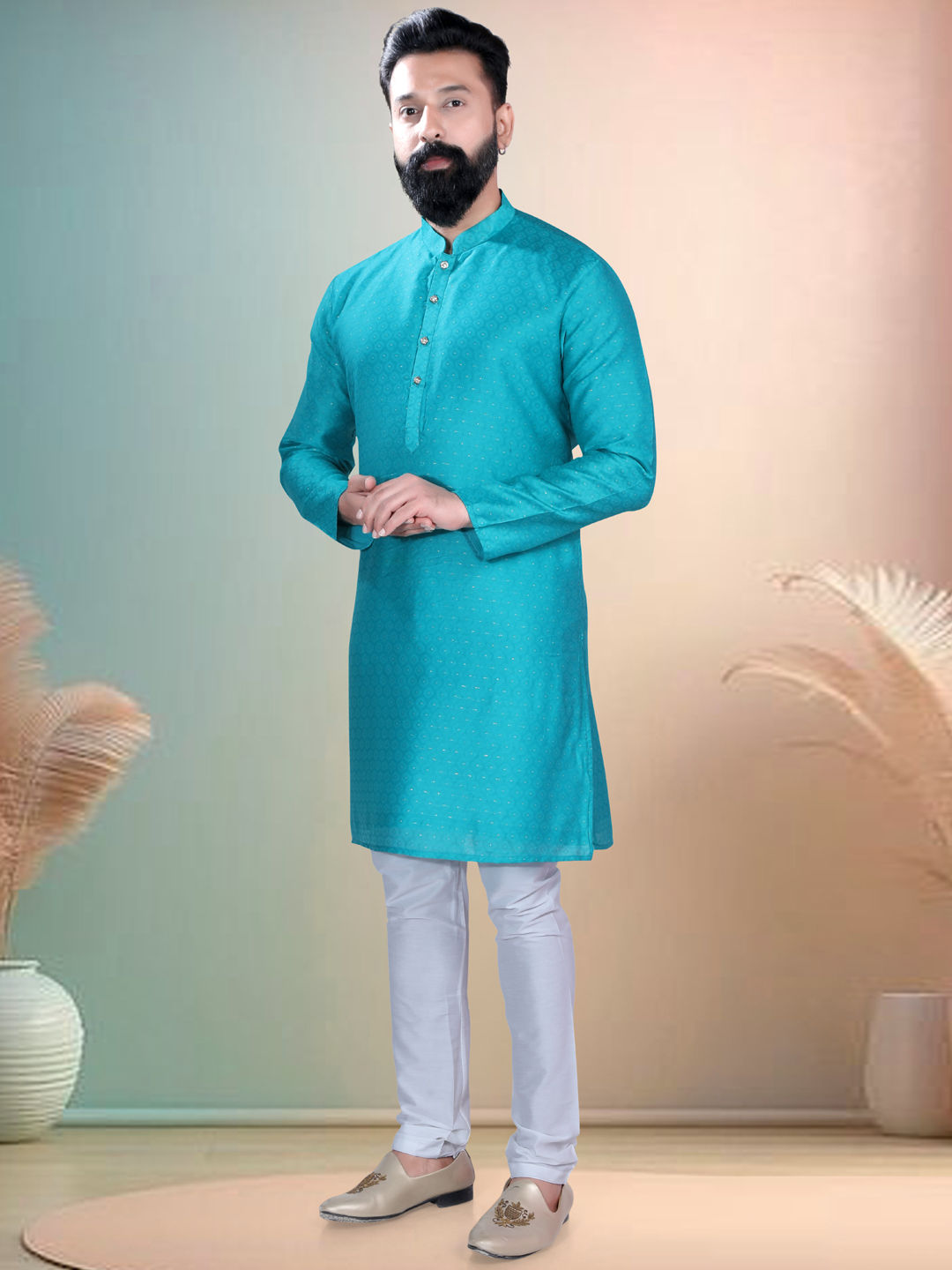 Cotton Traditional Kurta Pyjamas in Blue with Weaving work