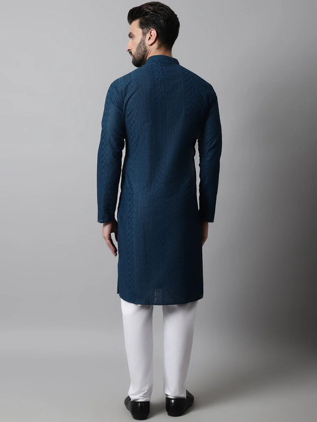 Blue color Kurta Pyjamas in Cotton fabric with Embroidered work
