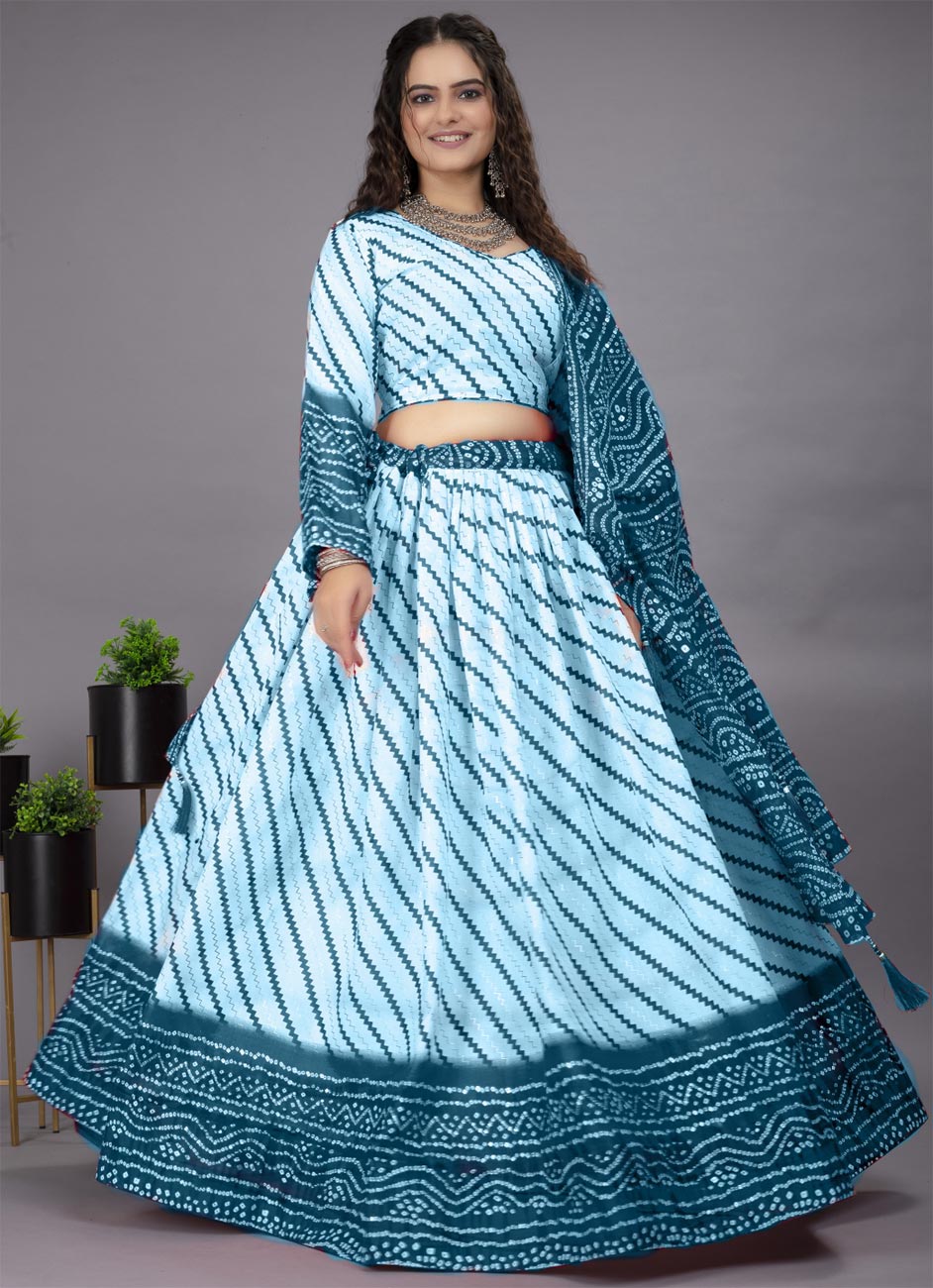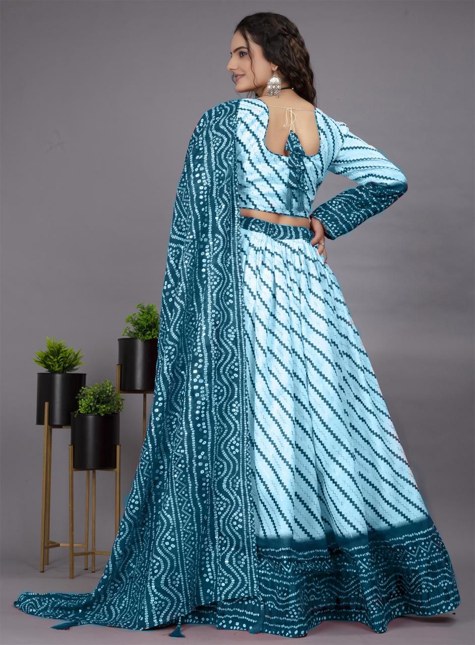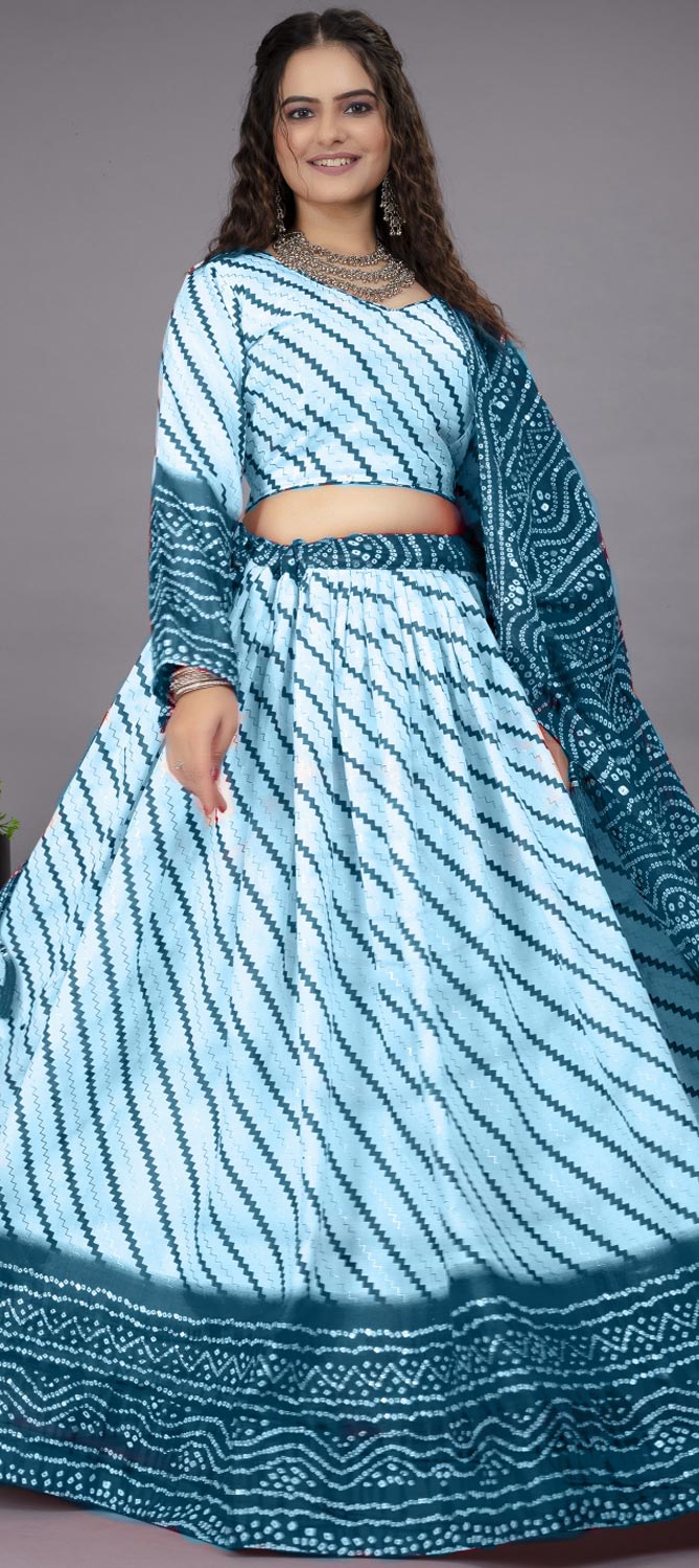 Blue, White and Off White color Lehenga in Cotton fabric with Bandhej, Printed work