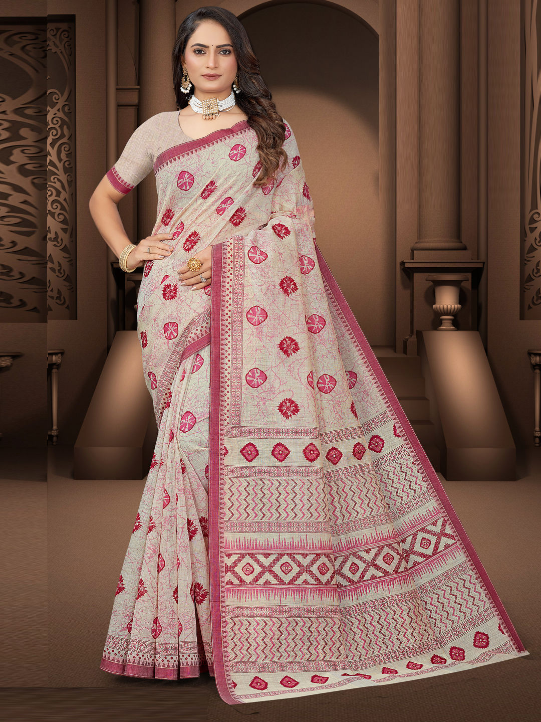 Beige and Brown color Saree in Cotton fabric with Printed work