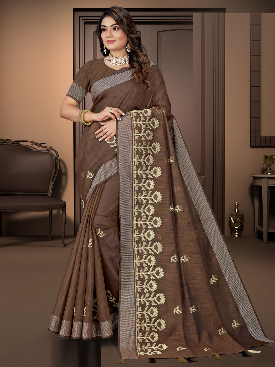 Beige and Brown color Saree in Cotton fabric with Embroidered, Resham work
