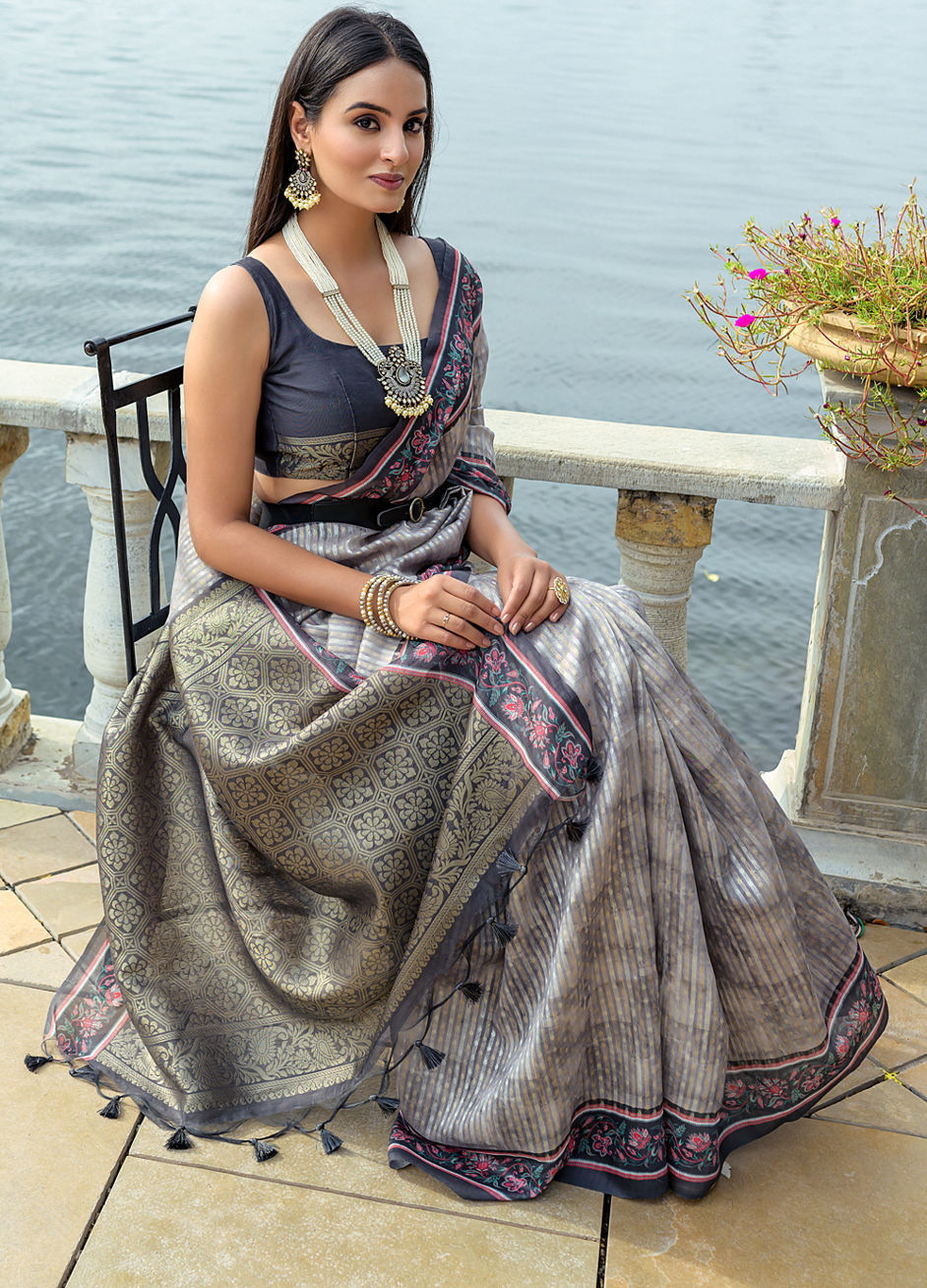 Black and Grey color Saree in Cotton fabric with Floral, Printed work
