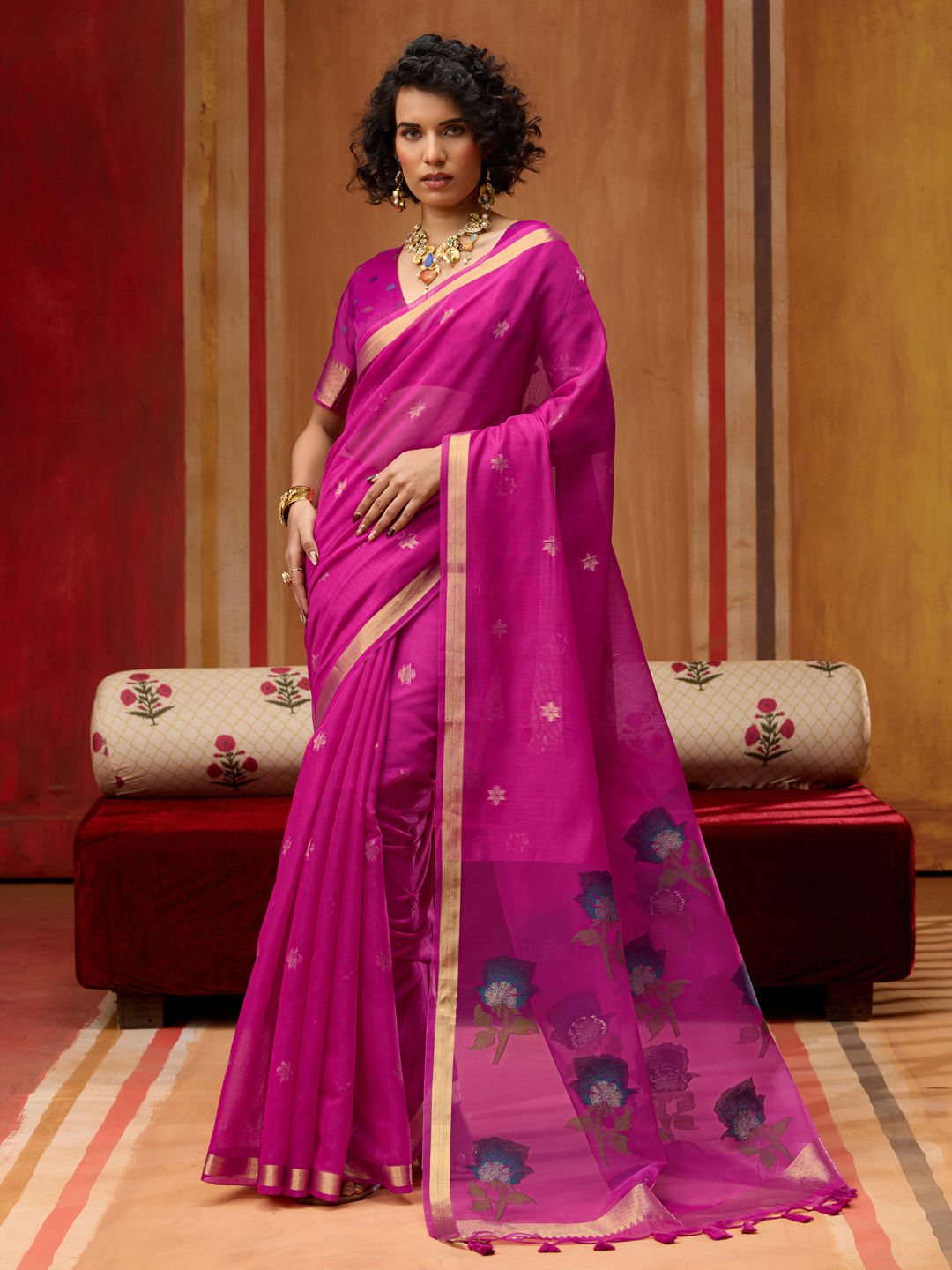Pink and Majenta color Saree in Cotton fabric with Floral, Printed, Weaving work