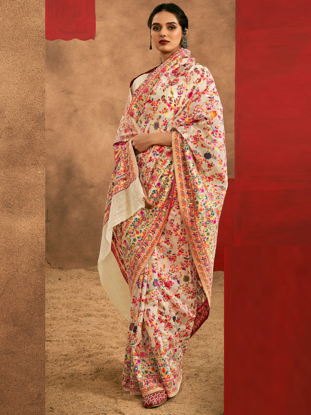 White and Off White color Saree in Cotton fabric with Printed, Weaving work