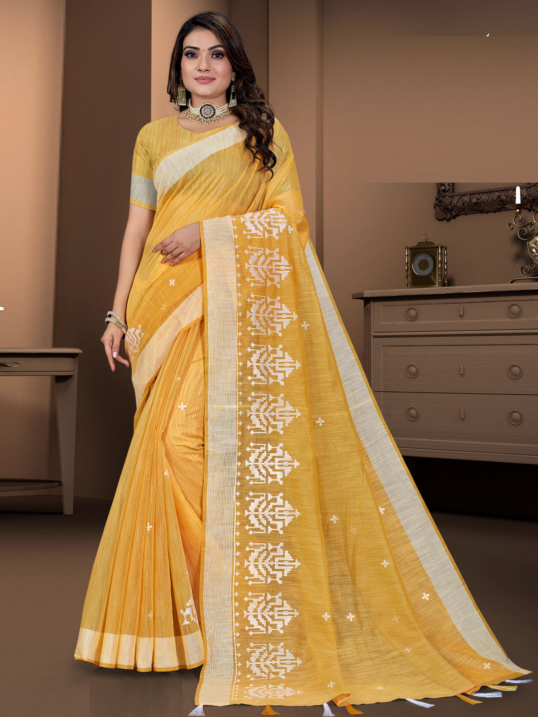Yellow color Saree in Cotton fabric with Embroidered, Resham work
