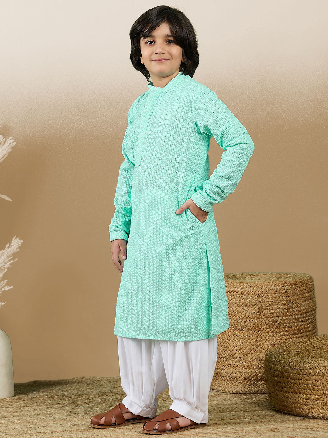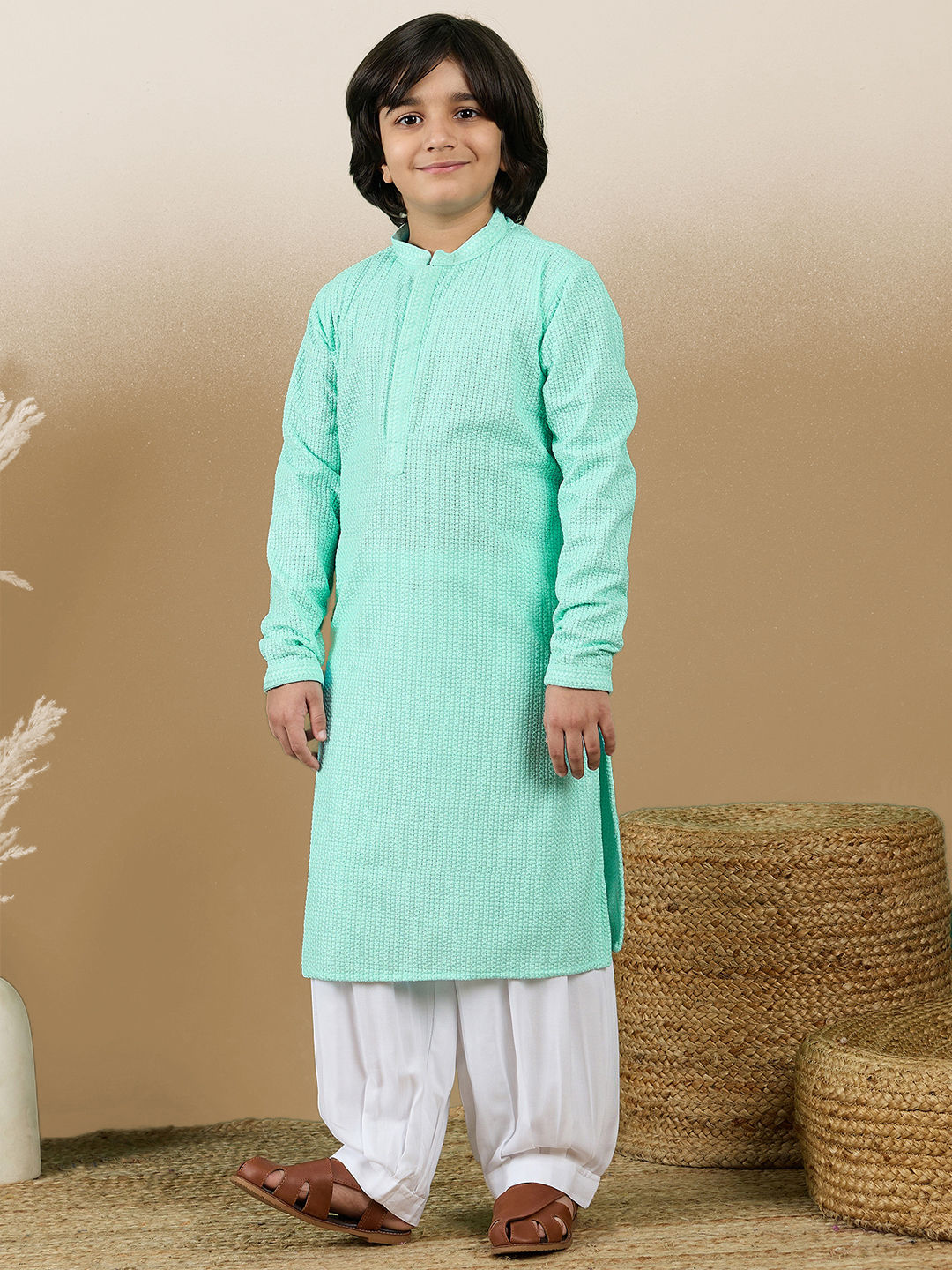 Cotton Wedding Boys Kurta Pyjama in Green with Zari work