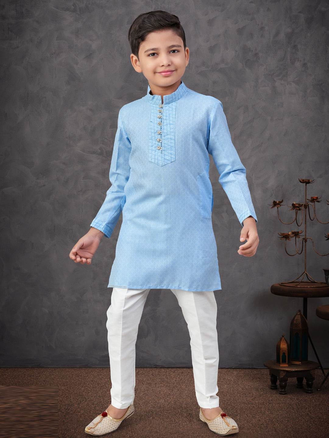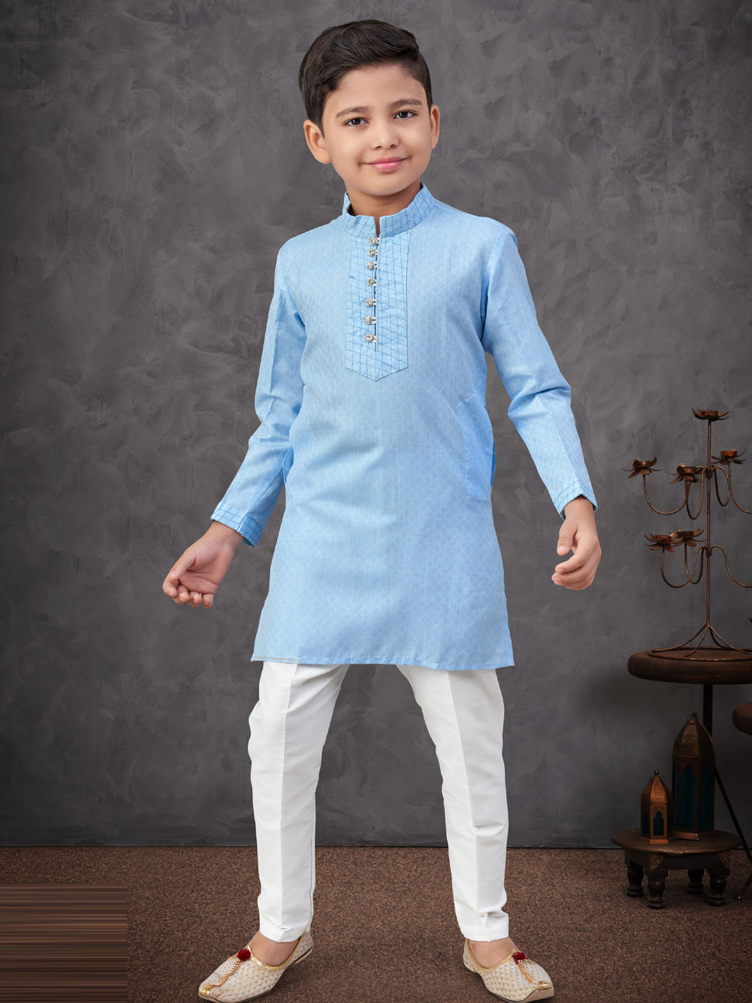 Cotton Wedding Boys Kurta Pyjama in Blue with Thread work