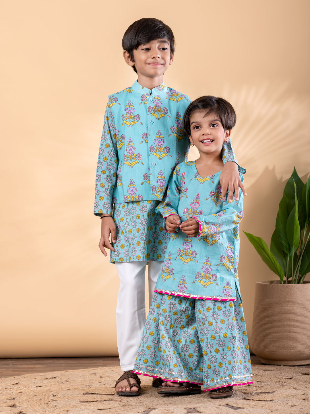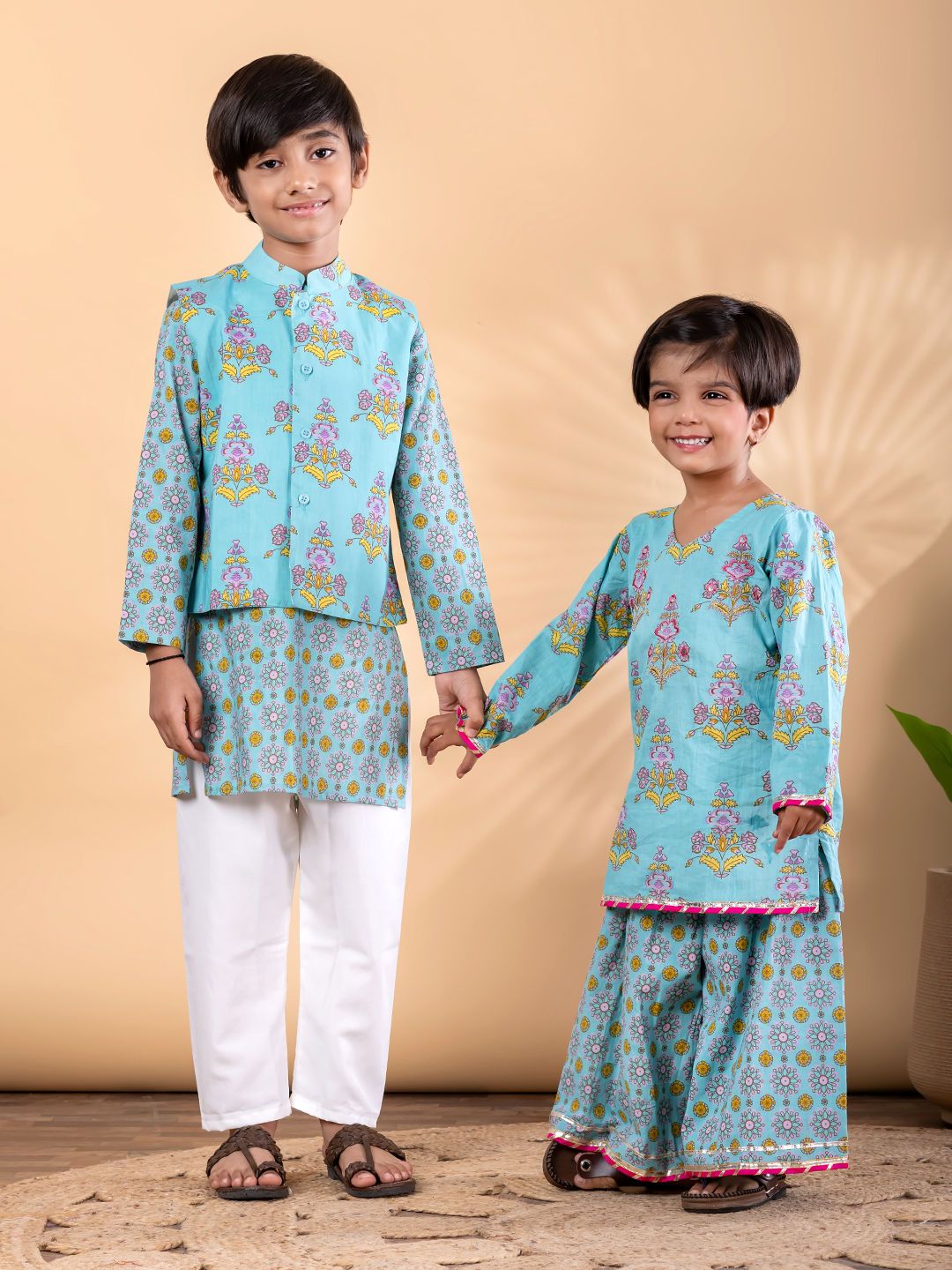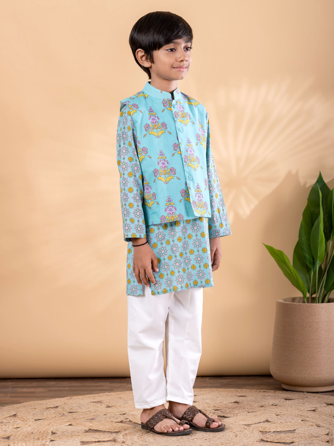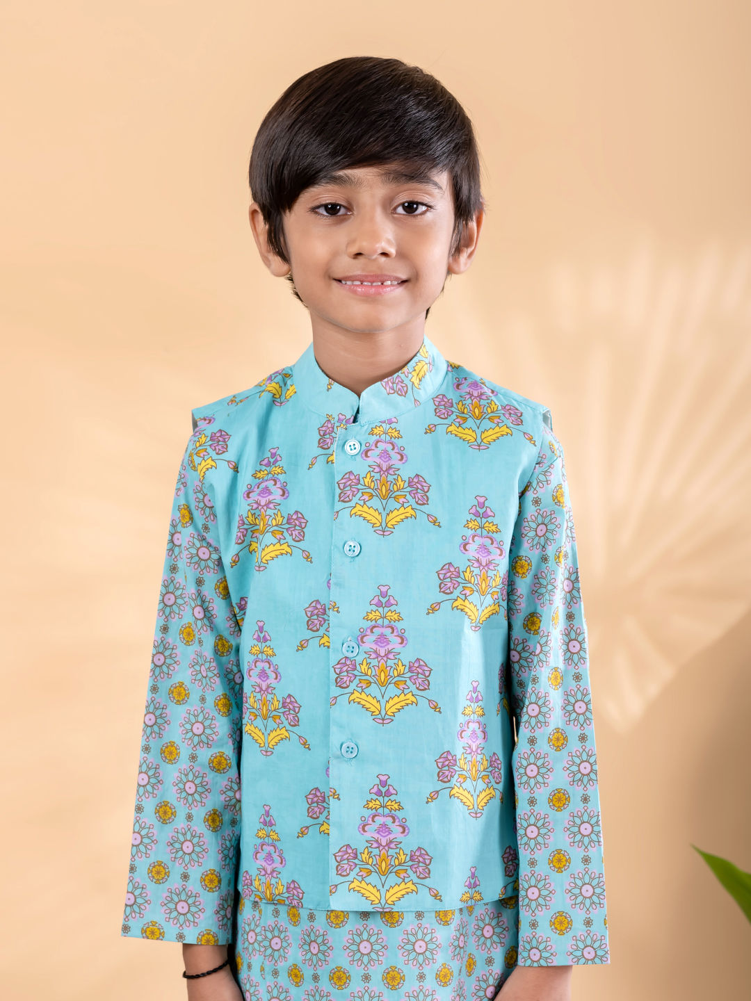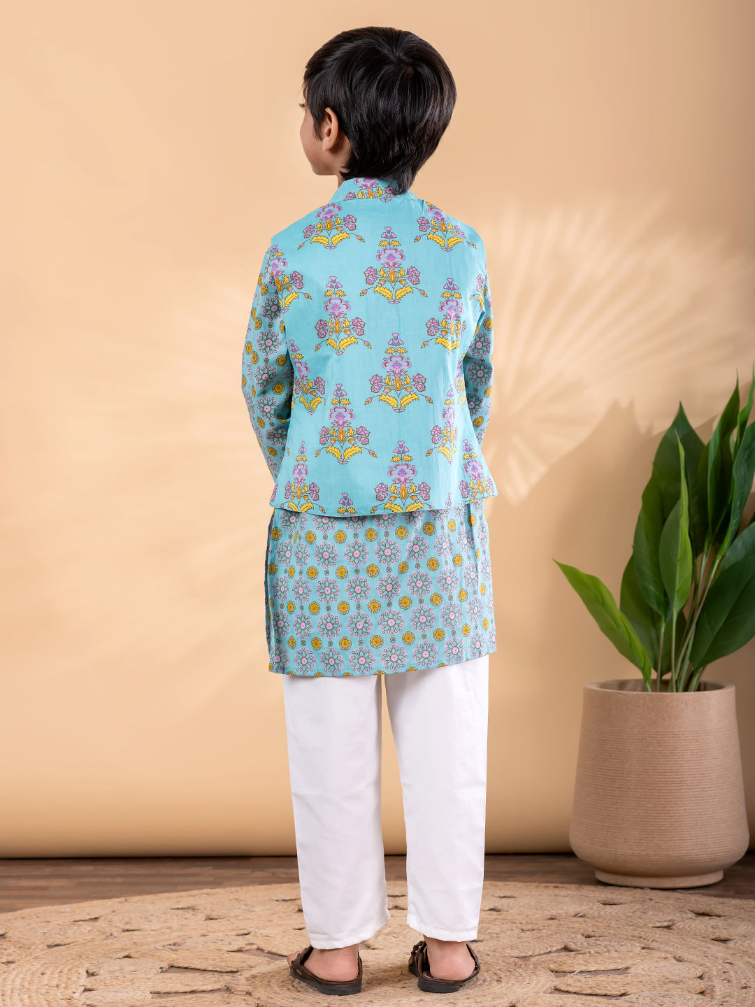 Blue color Boys Kurta Pyjama with Jacket in Cotton fabric with Floral, Printed work