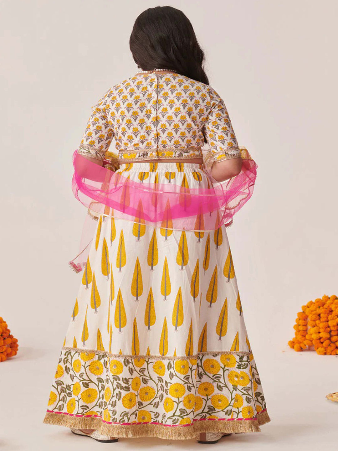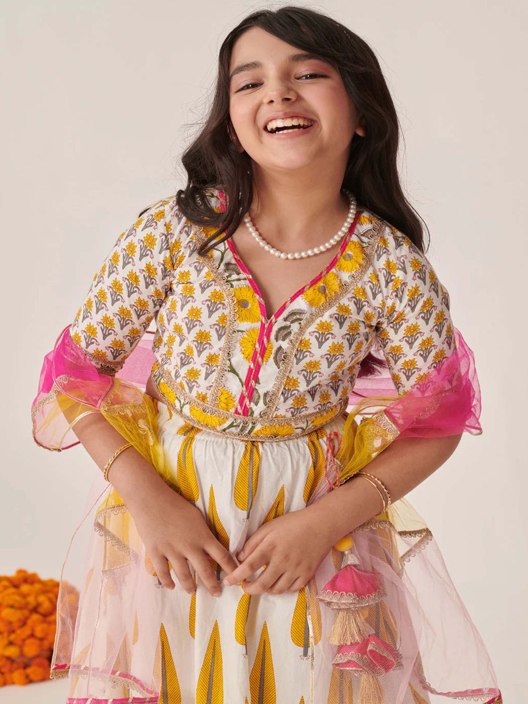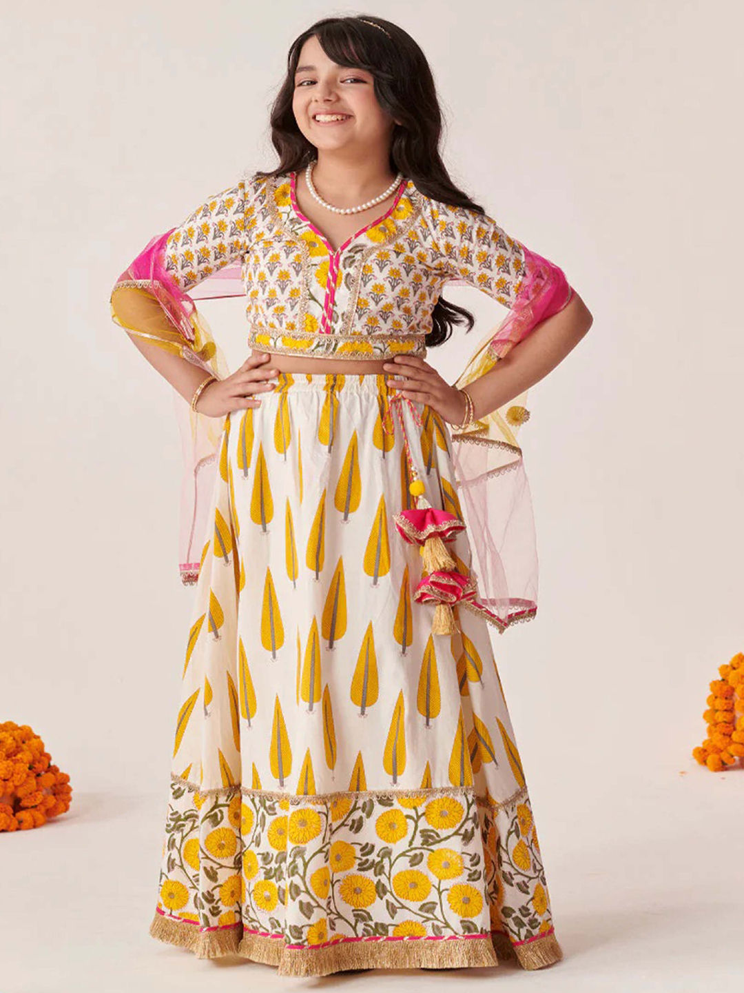 White and Off White, Yellow color Kids Lehenga in Cotton fabric with Floral, Lace, Printed work