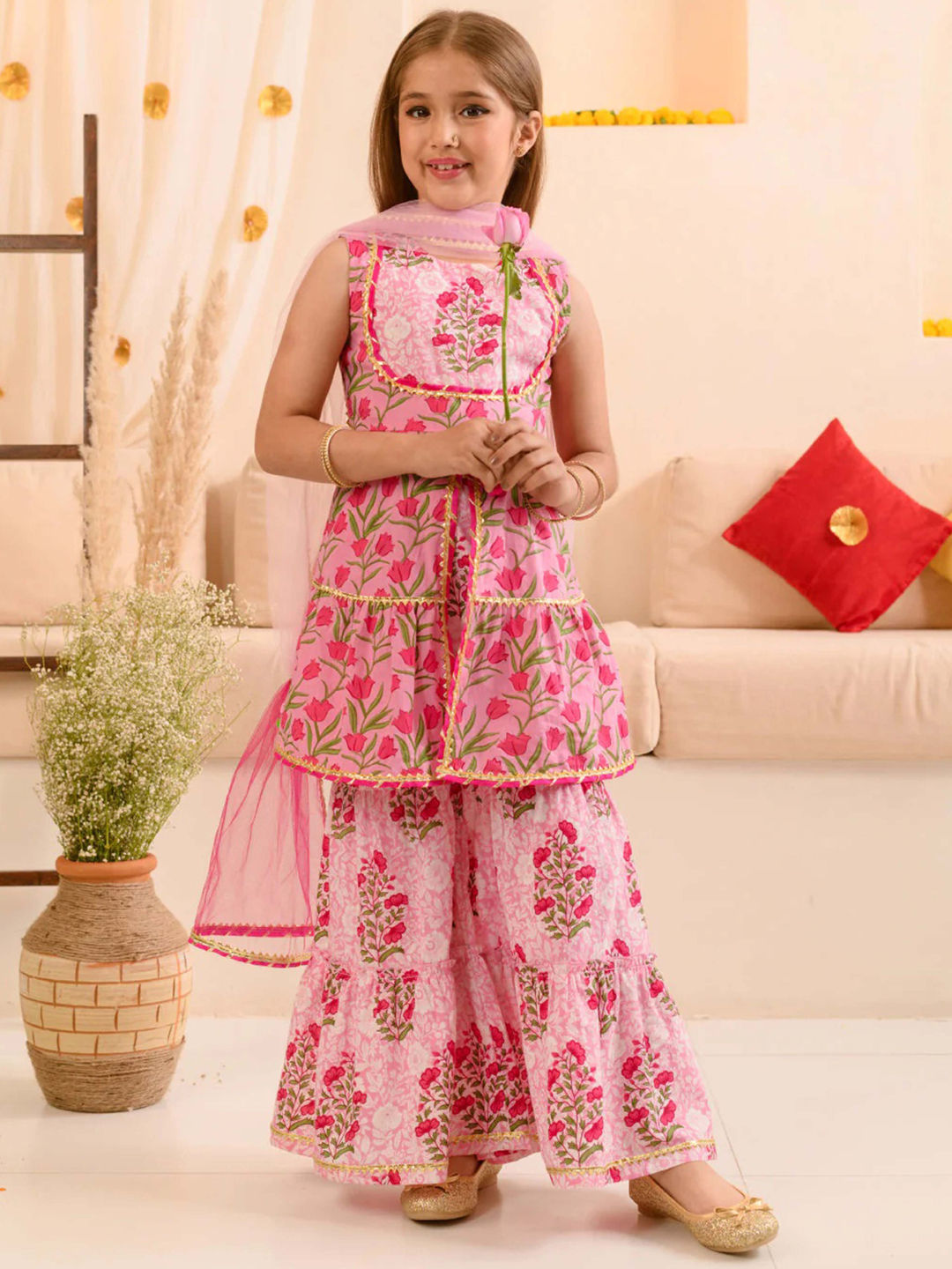 Pink and Majenta color Kids Salwar in Cotton fabric with Floral, Lace, Printed work