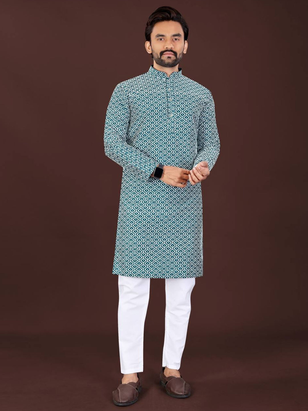 Cotton Festive Kurta Pyjamas in Green with Embroidered work