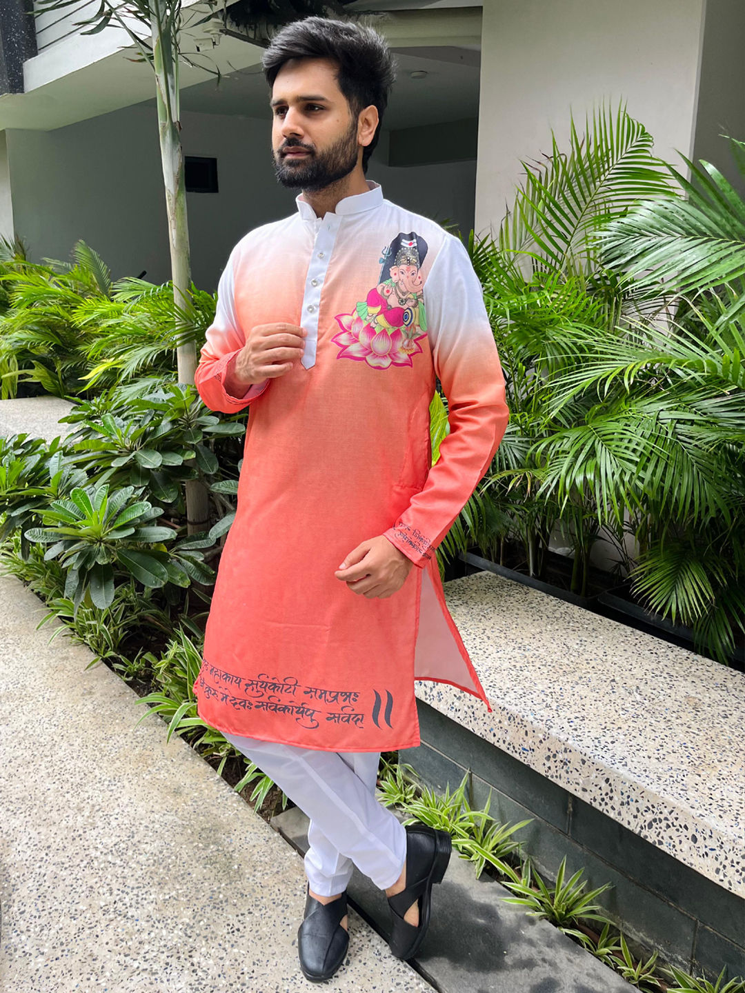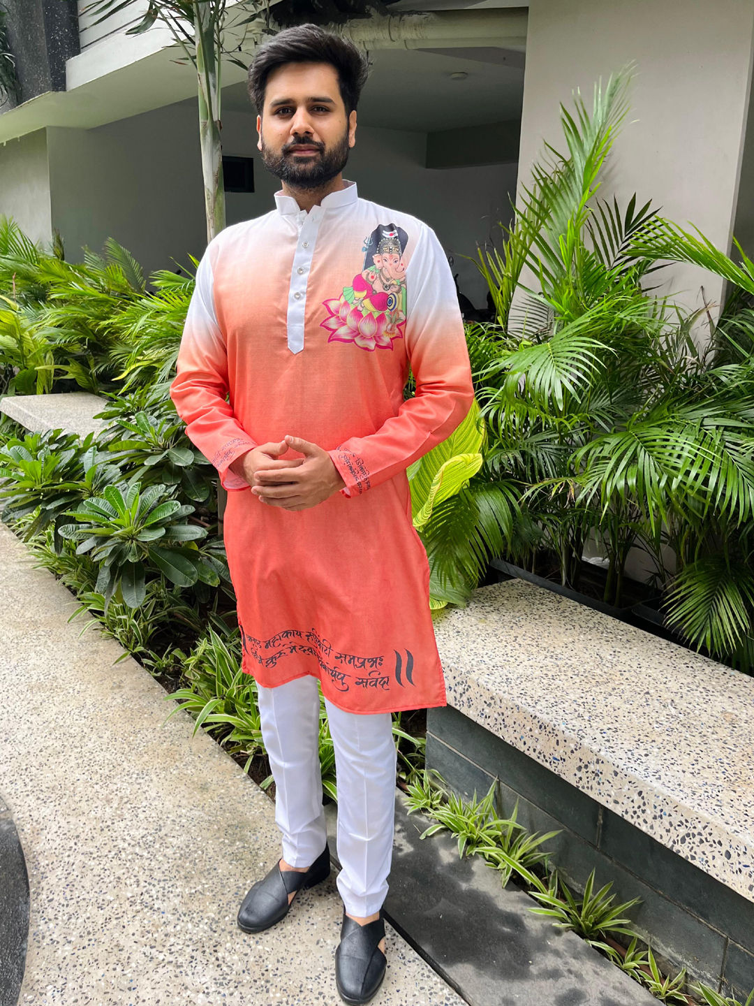 Orange color Kurta Pyjamas in Cotton fabric with Digital Print work