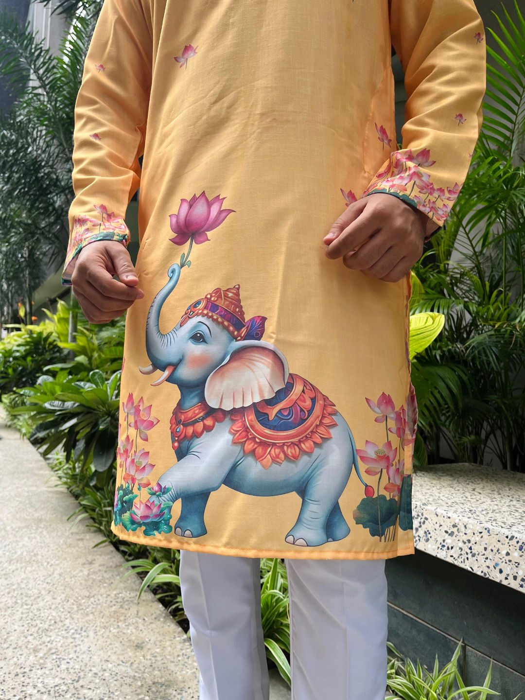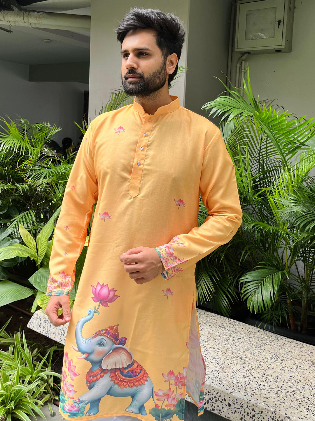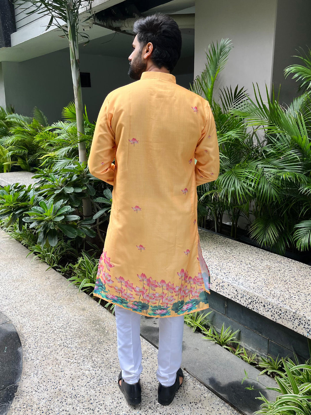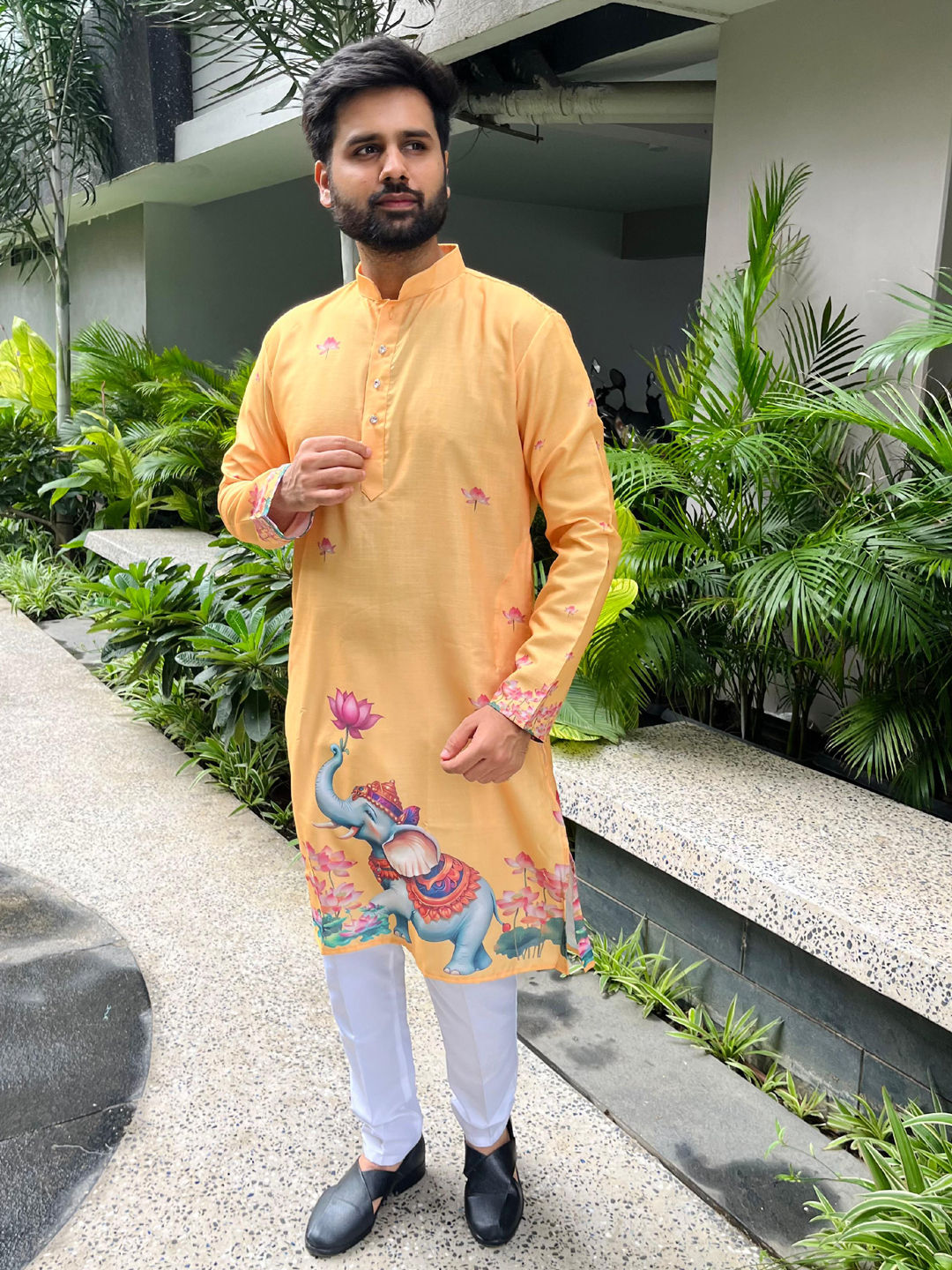 Cotton Wedding Kurta Pyjamas in Orange with Digital Print work