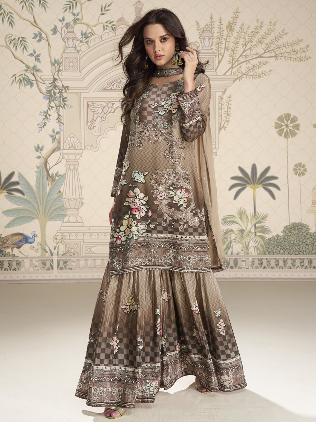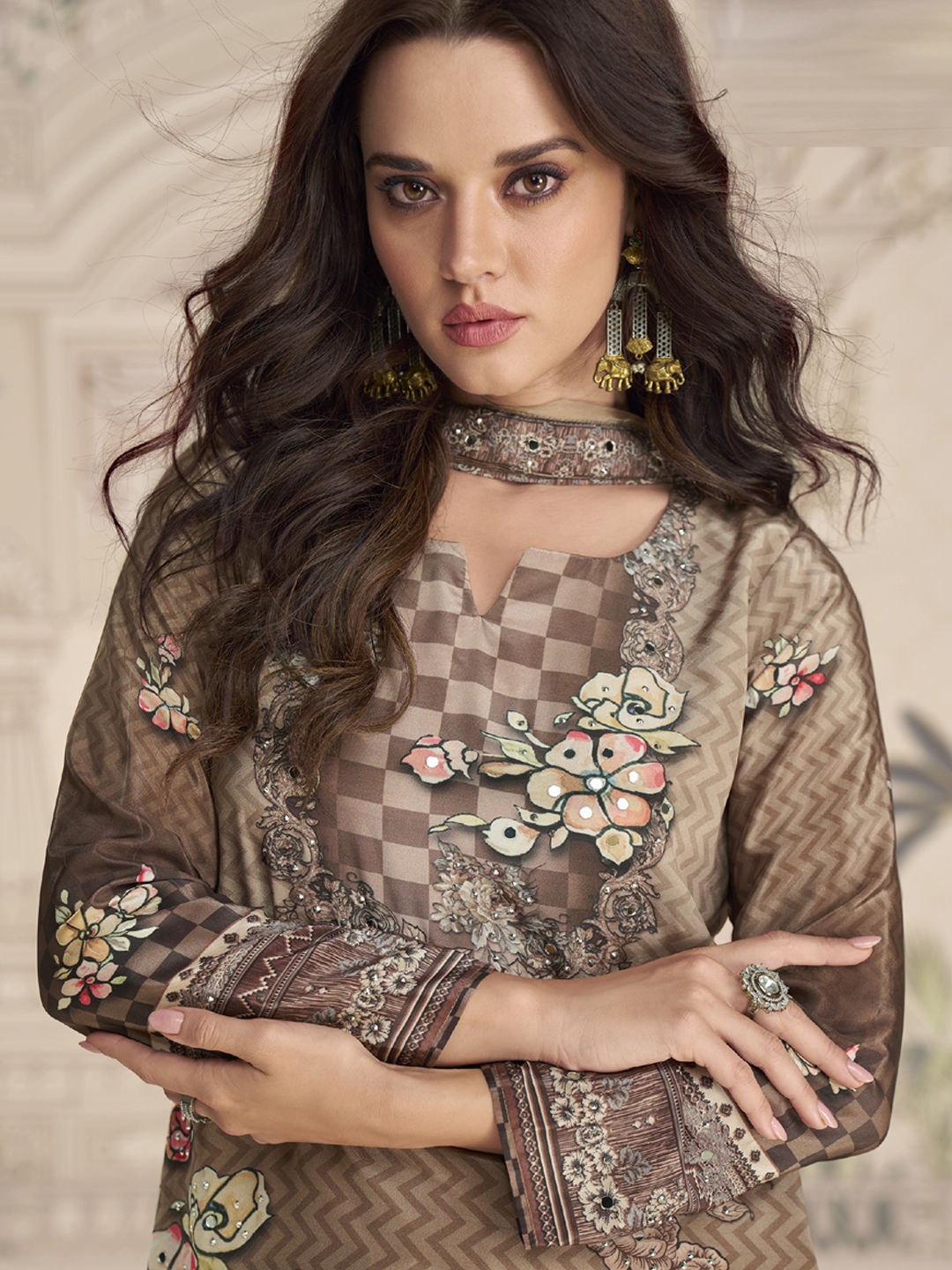 Beige and Brown color Salwar Kameez in Crepe Silk fabric with Mirror, Printed, Sequence work