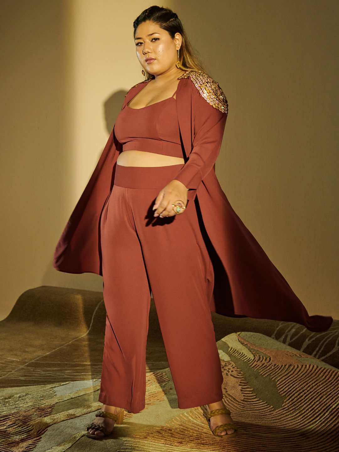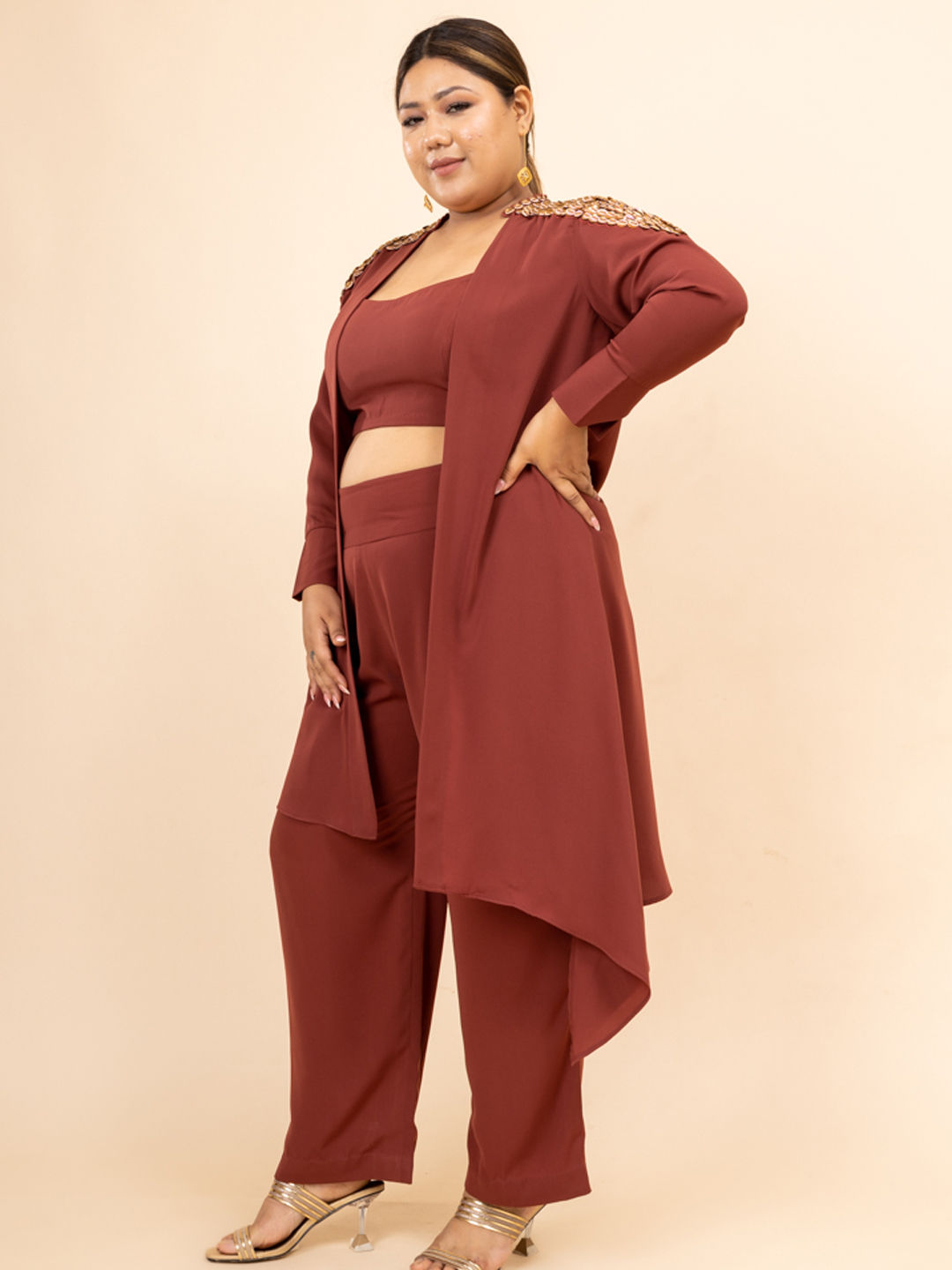 Crepe Silk Casual Co-ords Set in Beige and Brown with Bugle Beads work