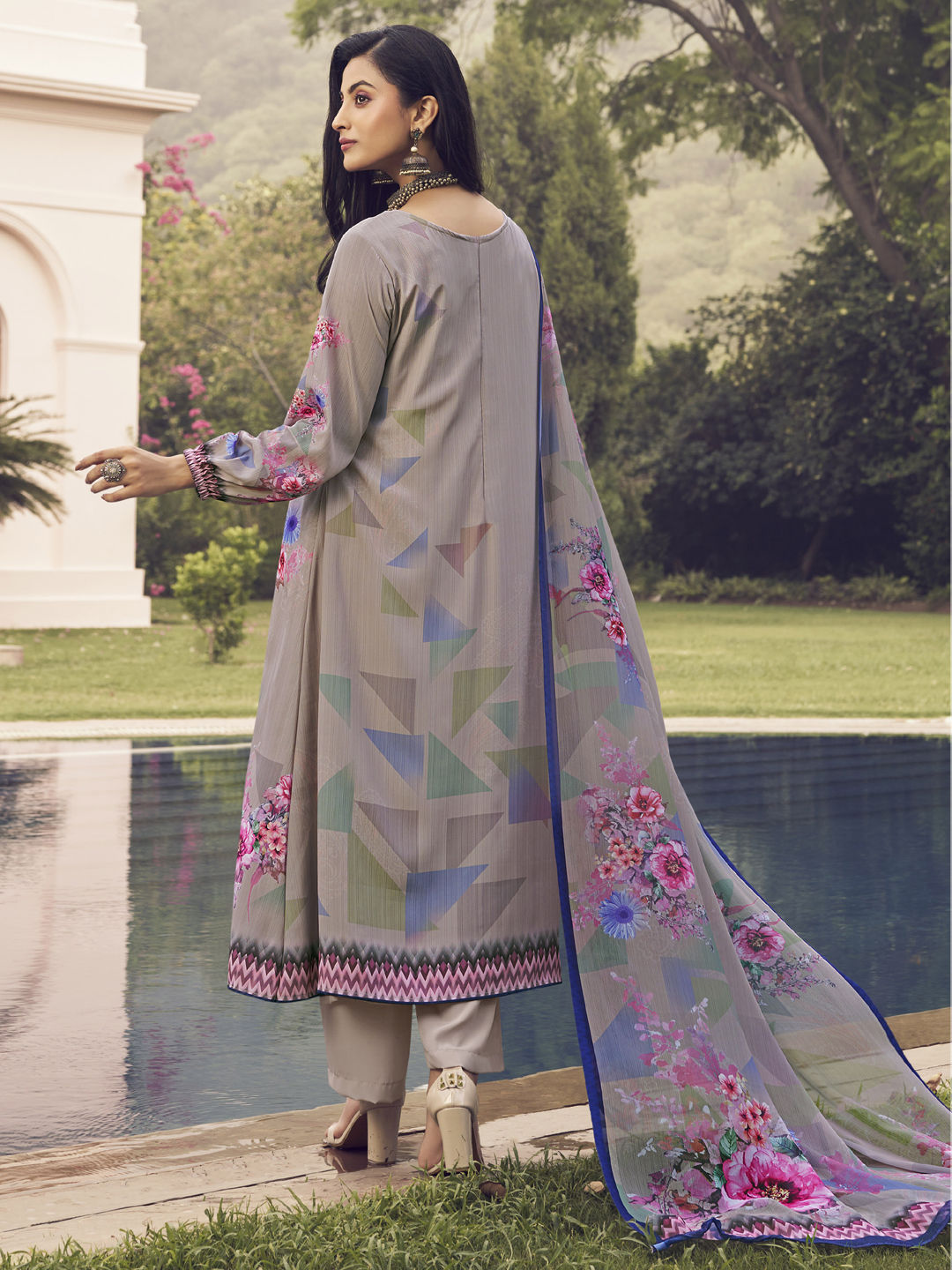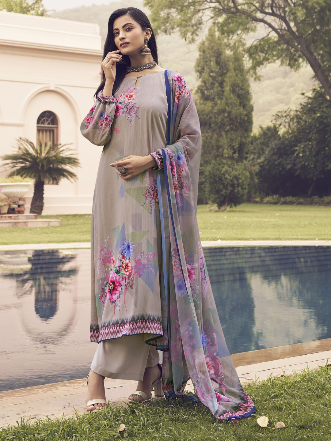 Beige and Brown color Salwar Kameez in Crepe Silk fabric with Floral, Printed work