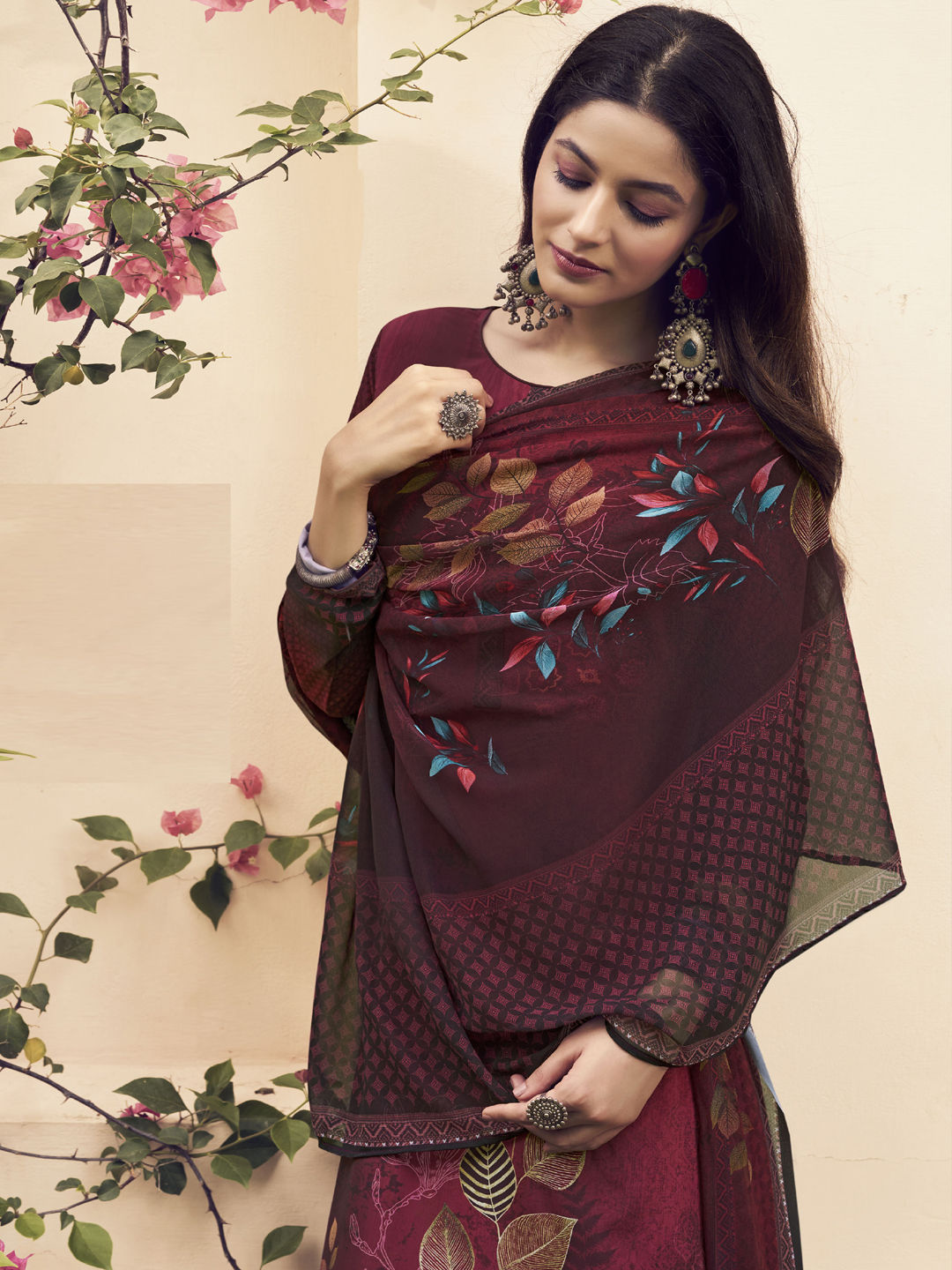 Red and Maroon color Salwar Kameez in Crepe Silk fabric with Floral, Printed work