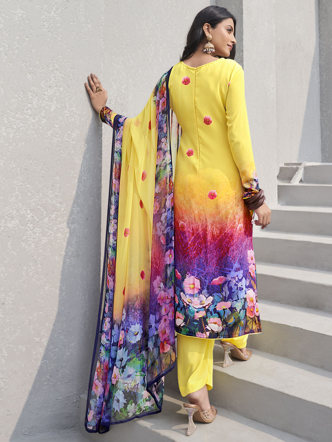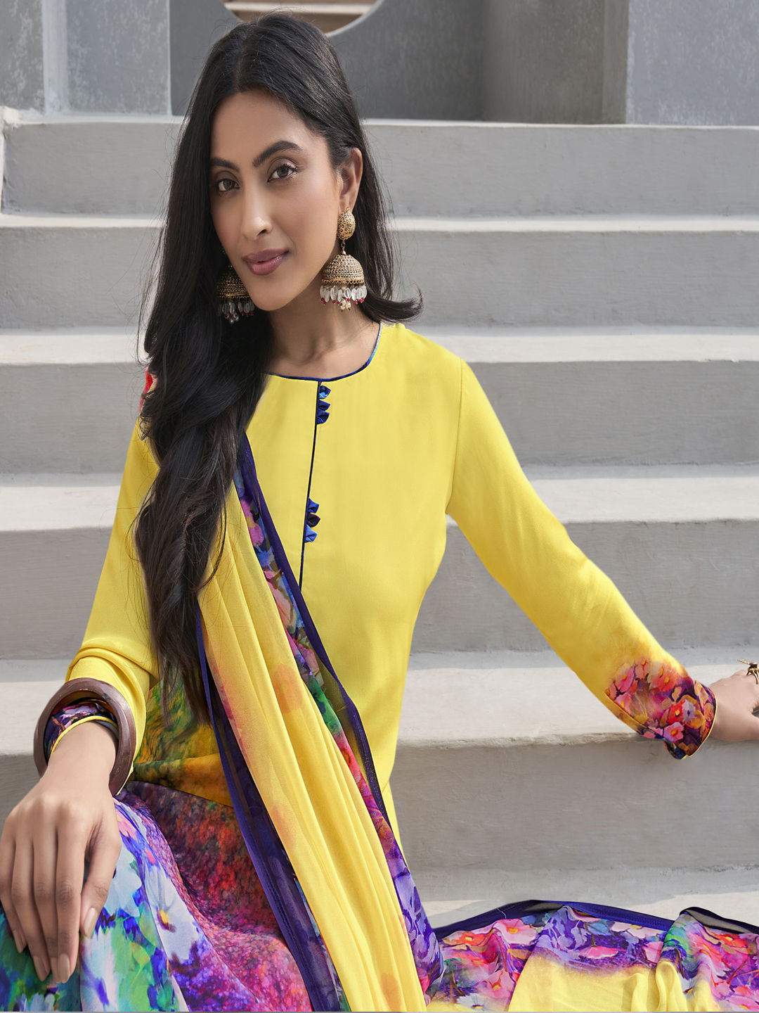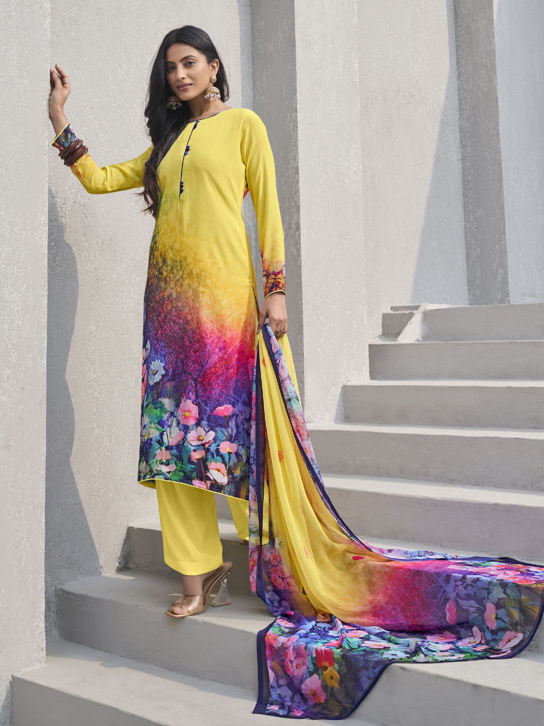 Pink and Majenta, Yellow color Salwar Kameez in Crepe Silk fabric with Digital Print, Floral work