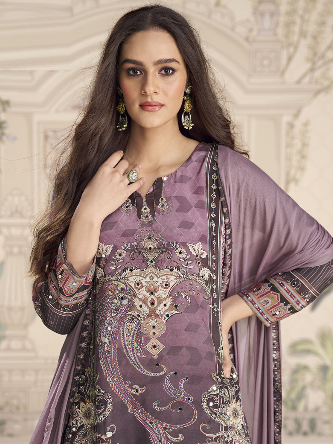 Crepe Silk Bollywood Salwar Kameez in Beige and Brown with Mirror work
