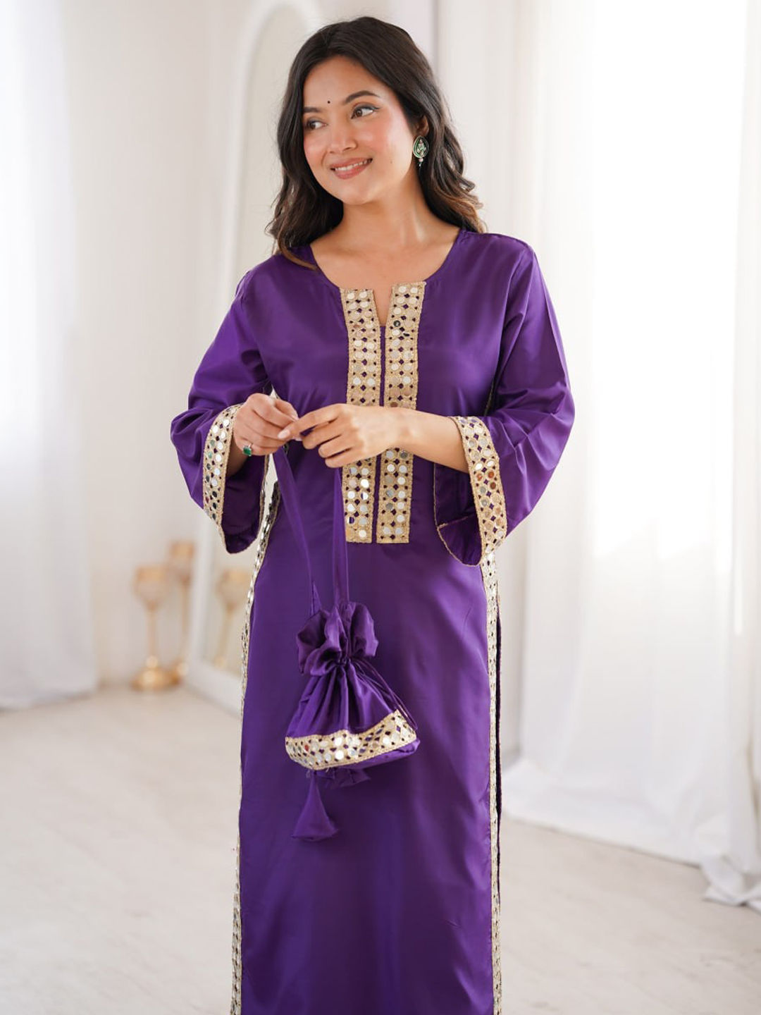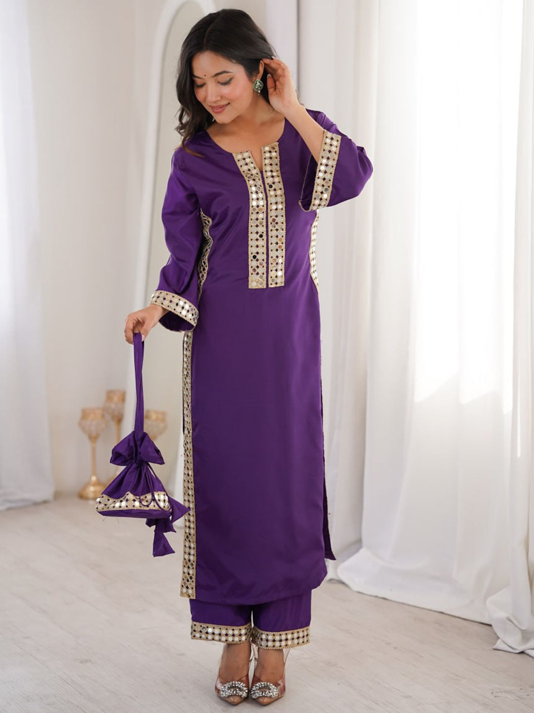 Purple and Violet color Salwar Kameez in Crepe Silk fabric with Lace, Mirror work