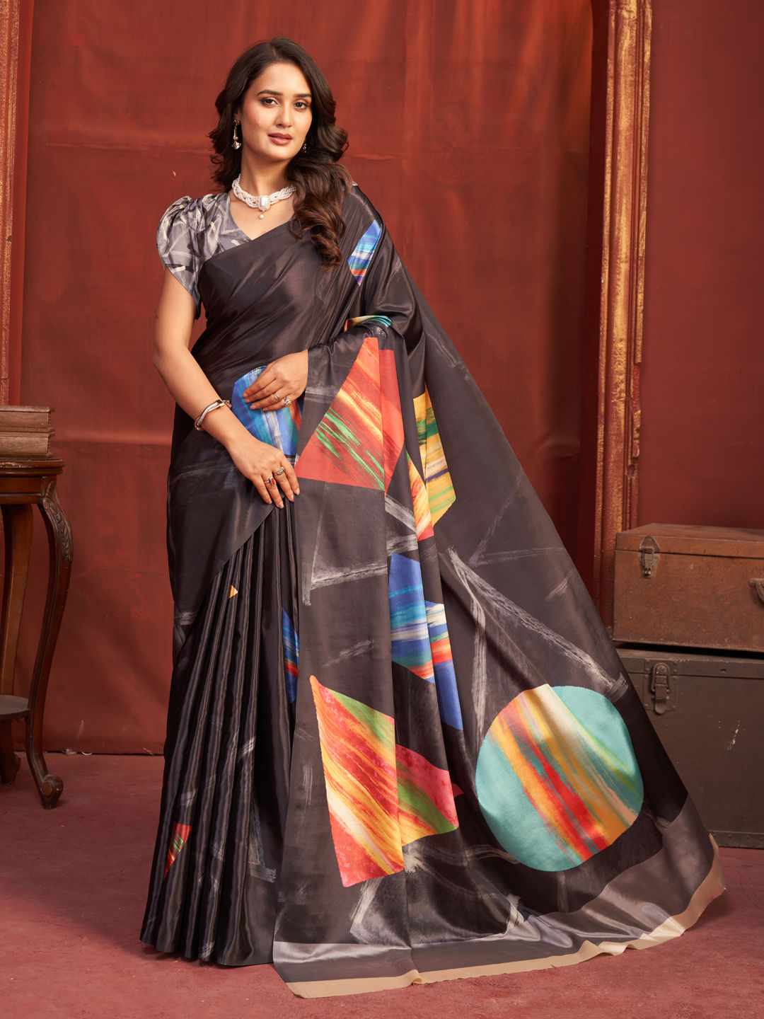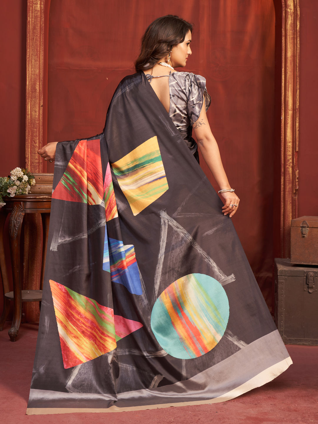 Crepe Silk Festive Saree in Black and Grey with Digital Print work