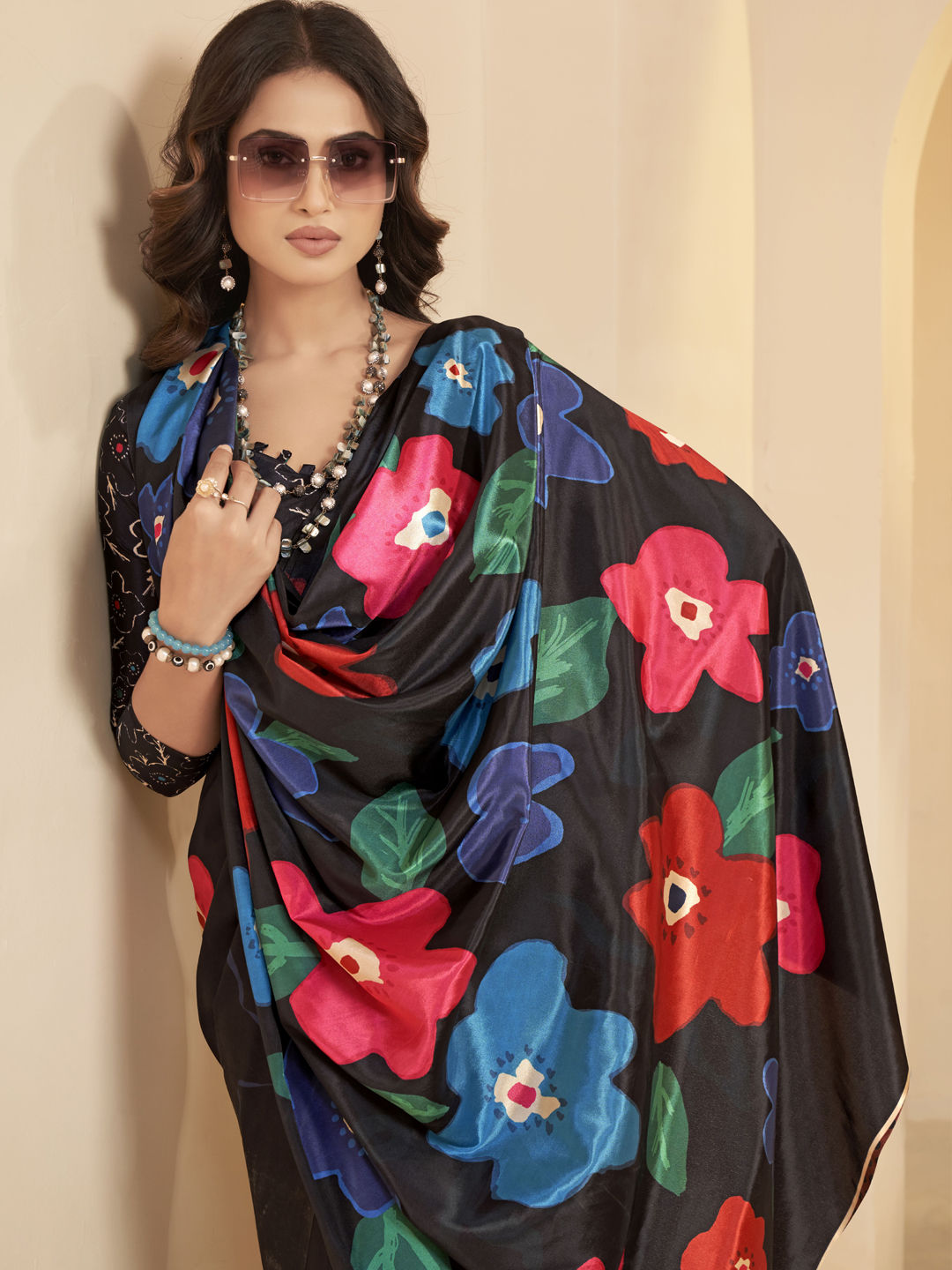 Black and Grey color Saree in Crepe Silk fabric with Digital Print, Floral work