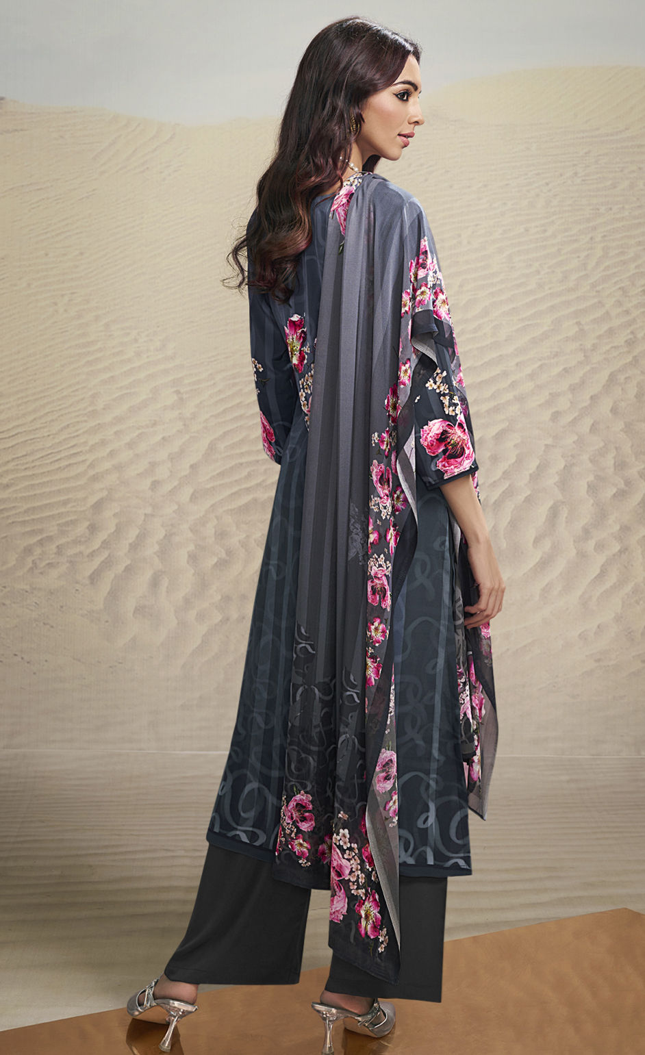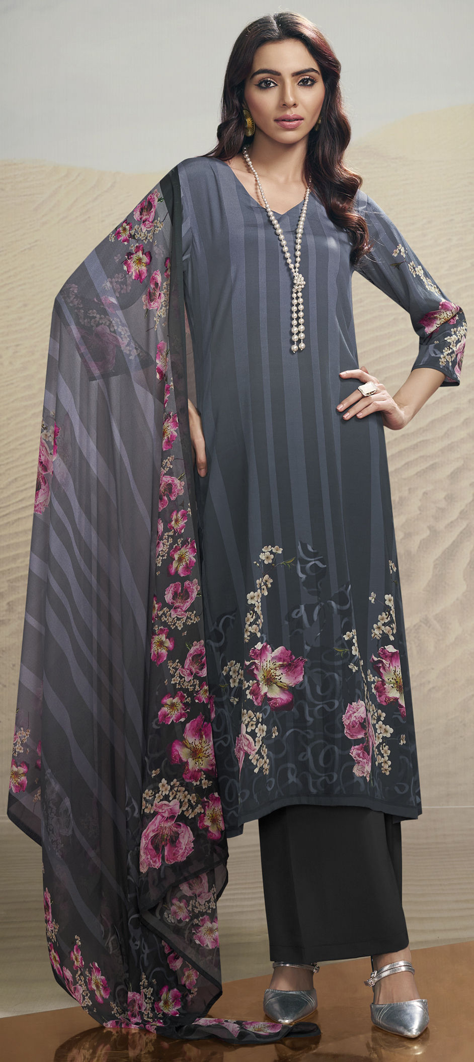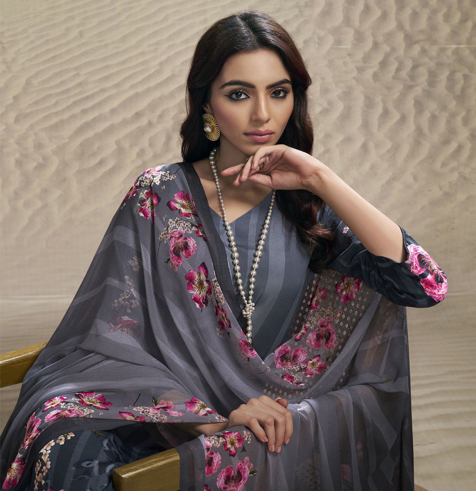 Black and Grey color Salwar Kameez in Crepe Silk fabric with Digital Print, Floral work