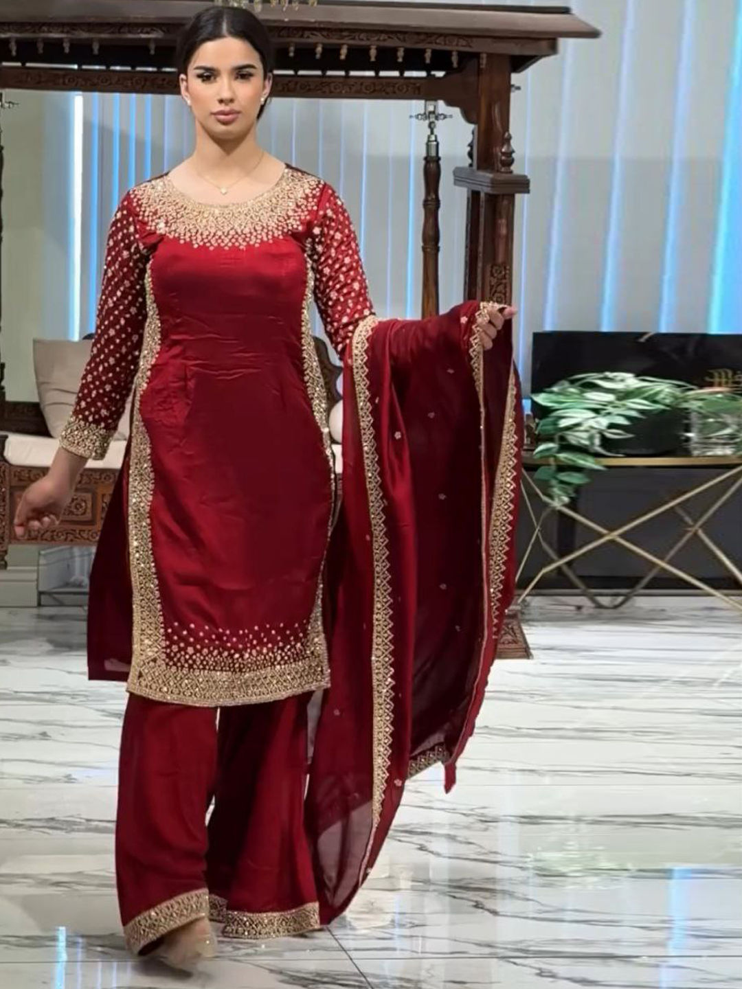 Red and Maroon color Salwar Kameez in Crepe Silk fabric with Embroidered, Sequence, Thread work