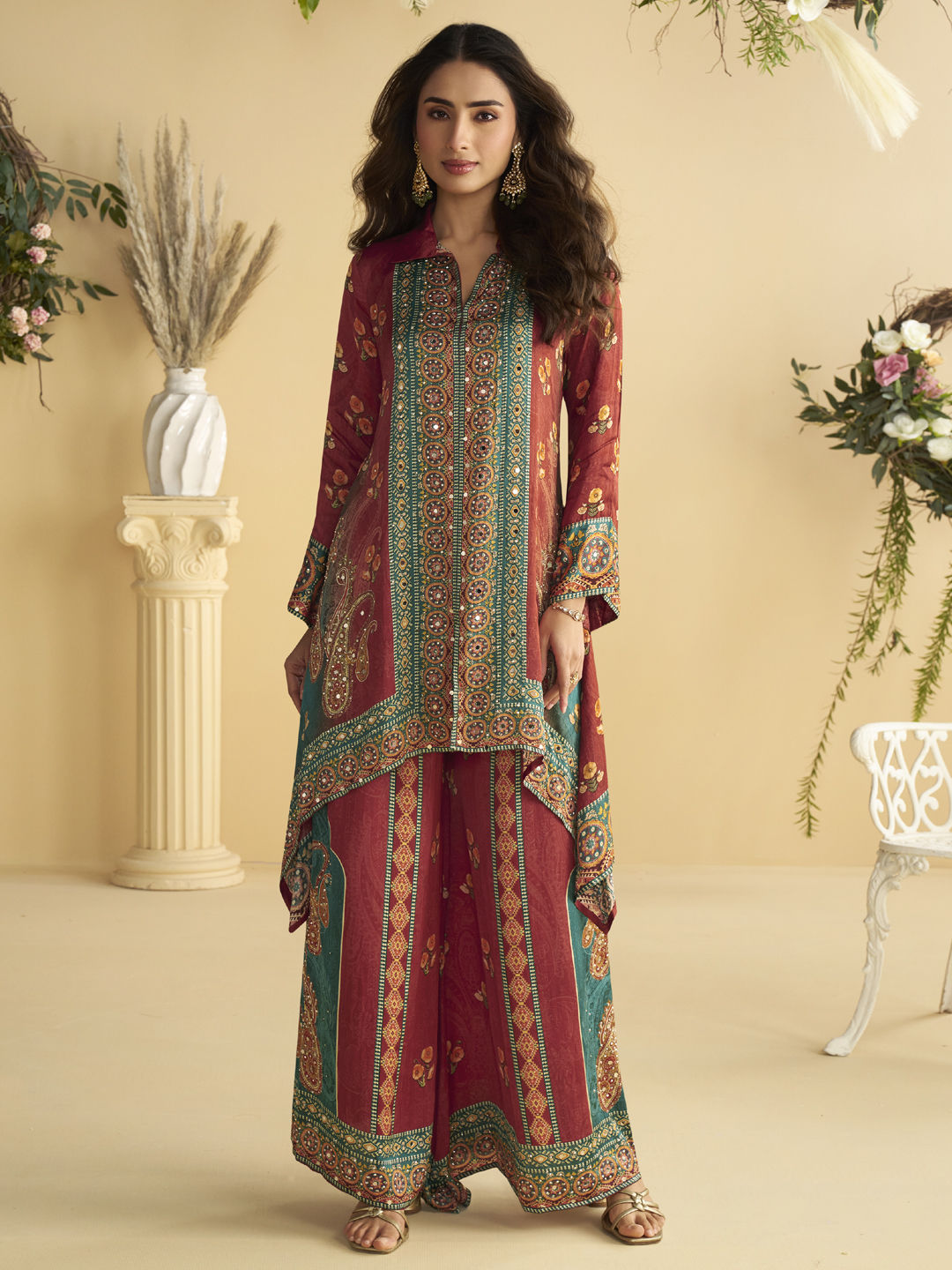 Red and Maroon color Salwar Kameez in Crepe Silk fabric with Digital Print, Mirror, Sequence work