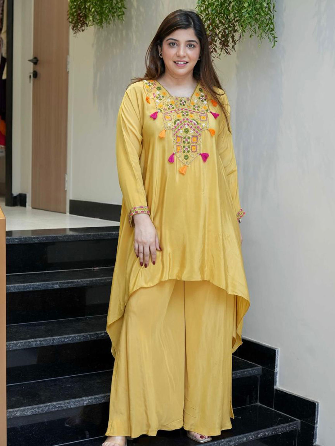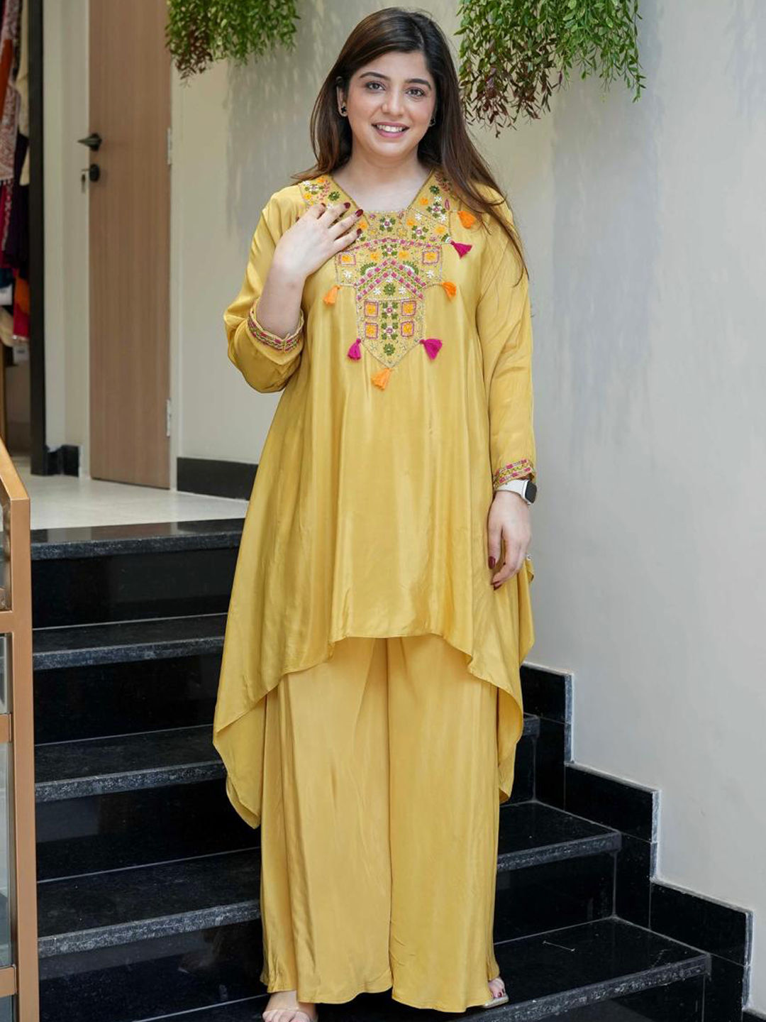 Yellow color Salwar Kameez in Crepe Silk fabric with Embroidered, Thread work