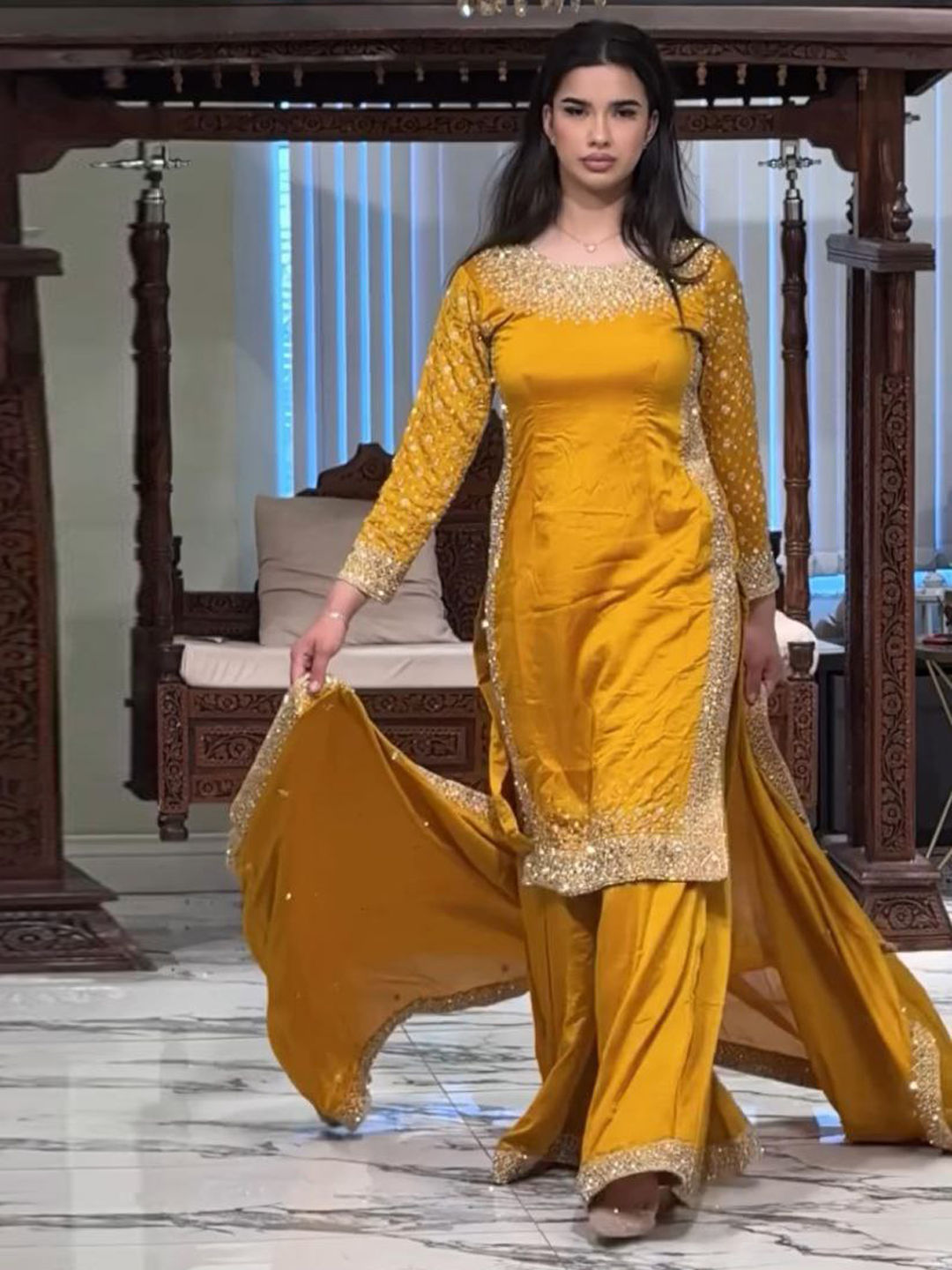 Yellow color Salwar Kameez in Crepe Silk fabric with Embroidered, Sequence, Thread work
