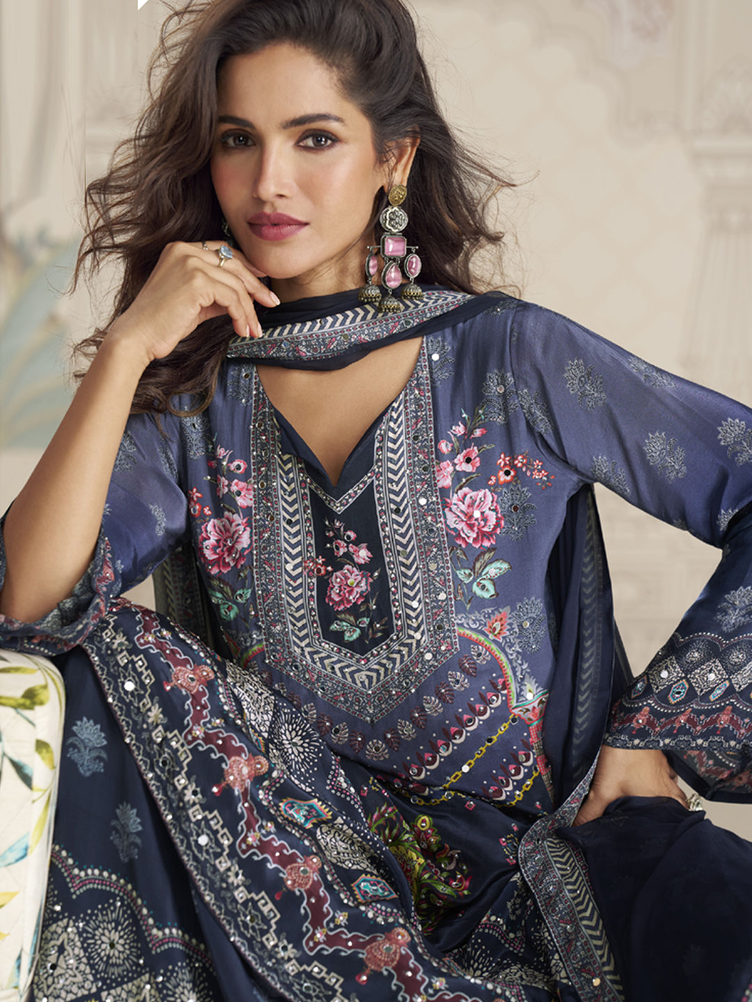 Blue color Salwar Kameez in Crepe Silk fabric with Mirror, Printed, Sequence work