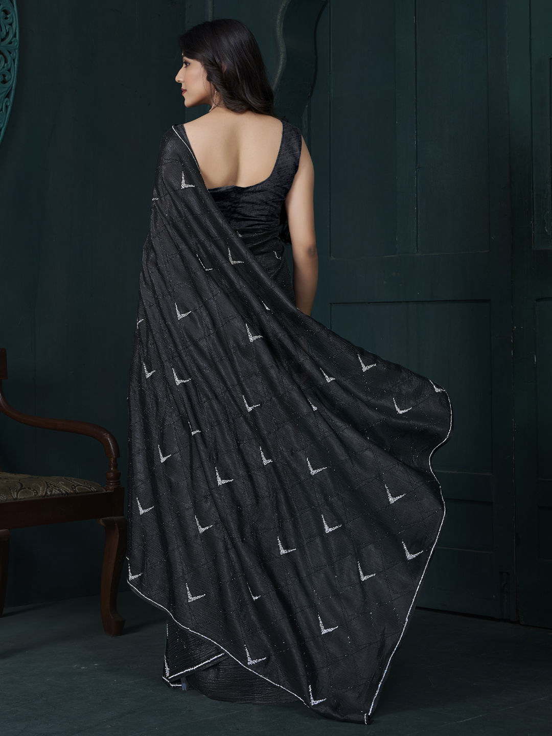 Black and Grey color Saree in Crepe Silk fabric with Stone, Swarovski work