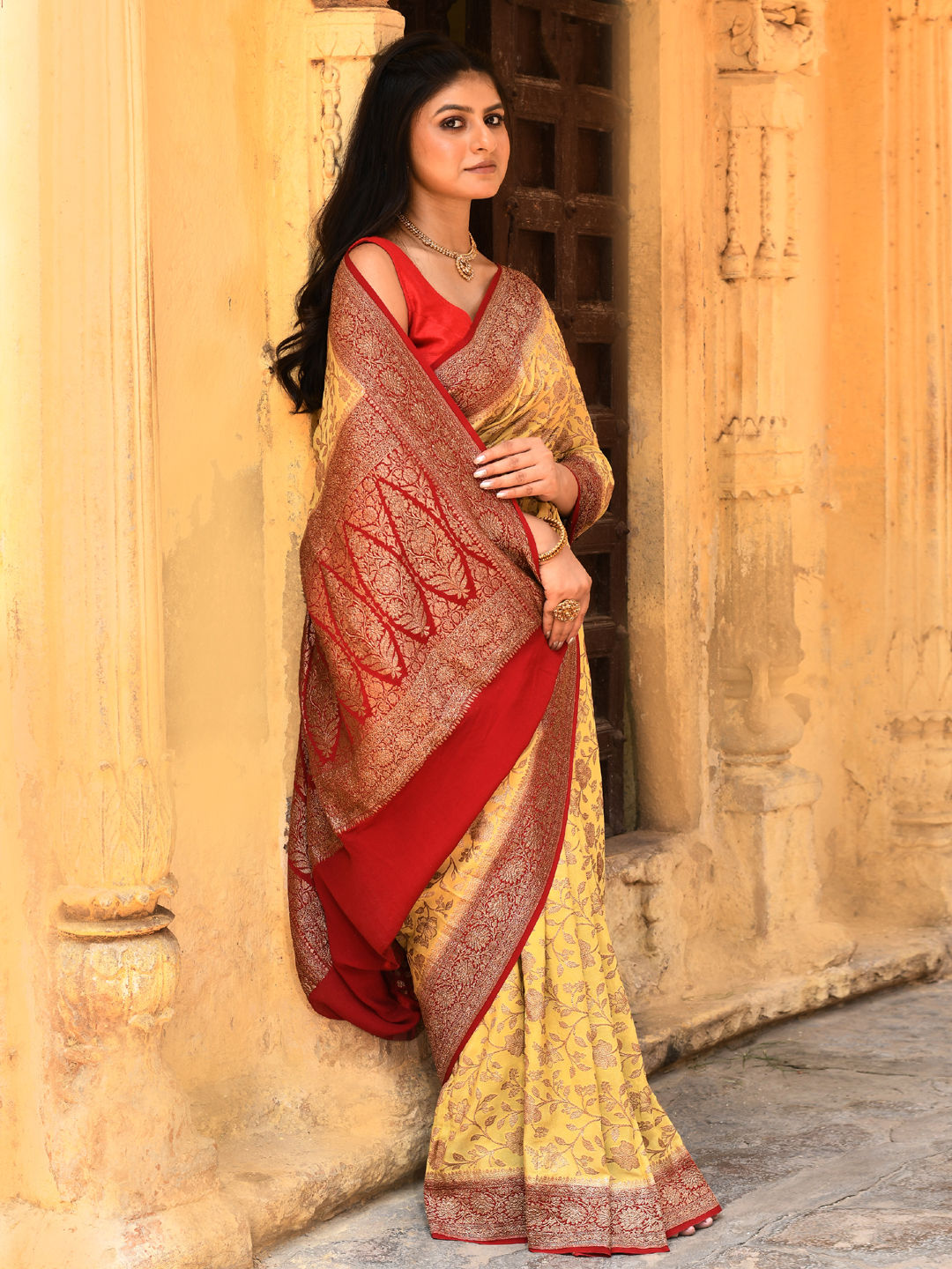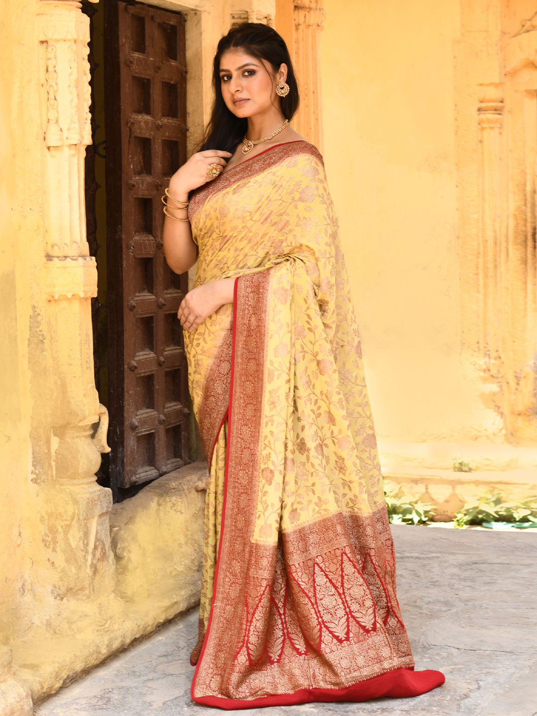 Yellow color Saree in Chiffon, Crepe Silk fabric with Border, Zari work