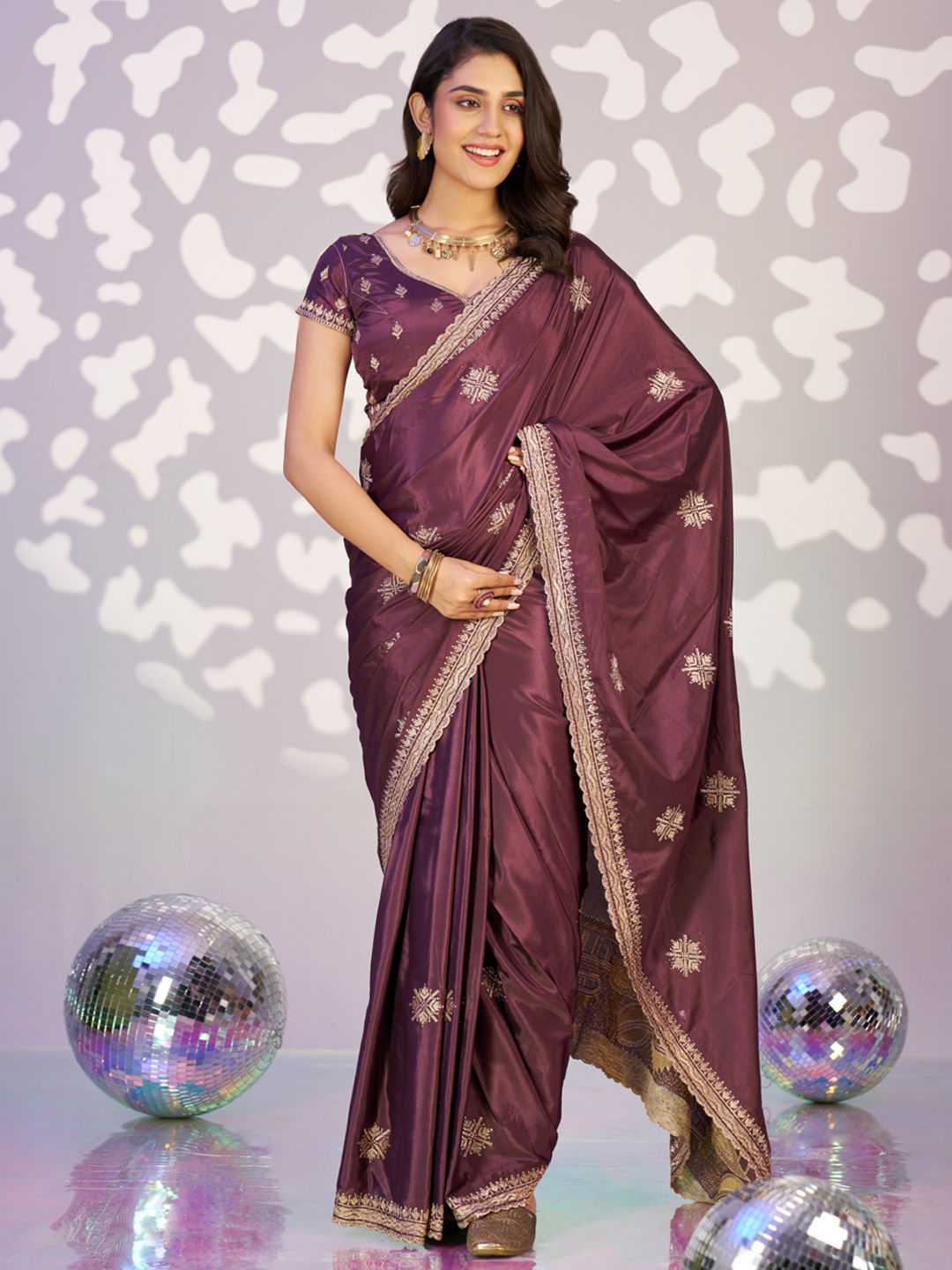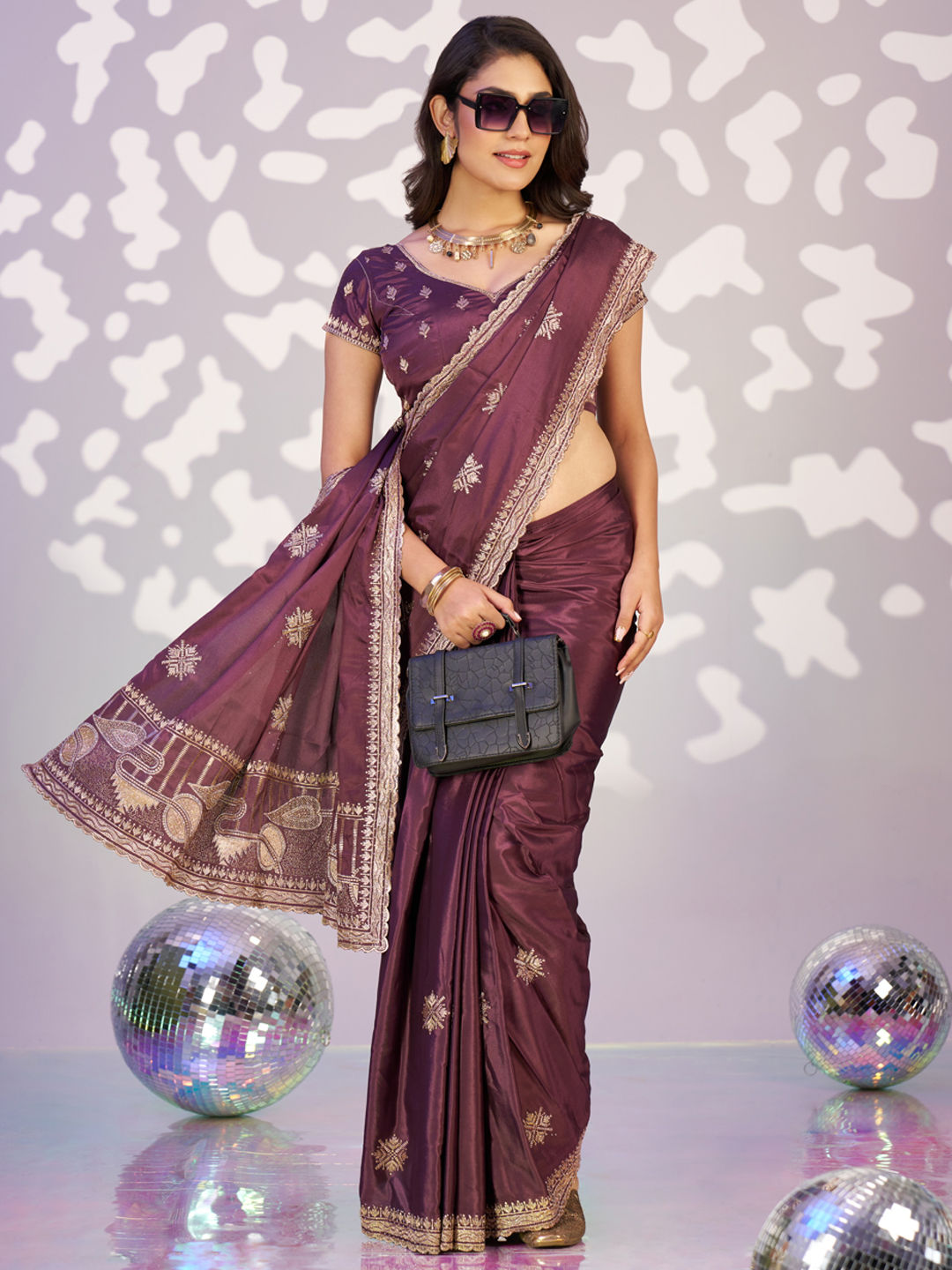 Purple and Violet color Readymade Saree in Crepe Silk fabric with Embroidered, Thread work