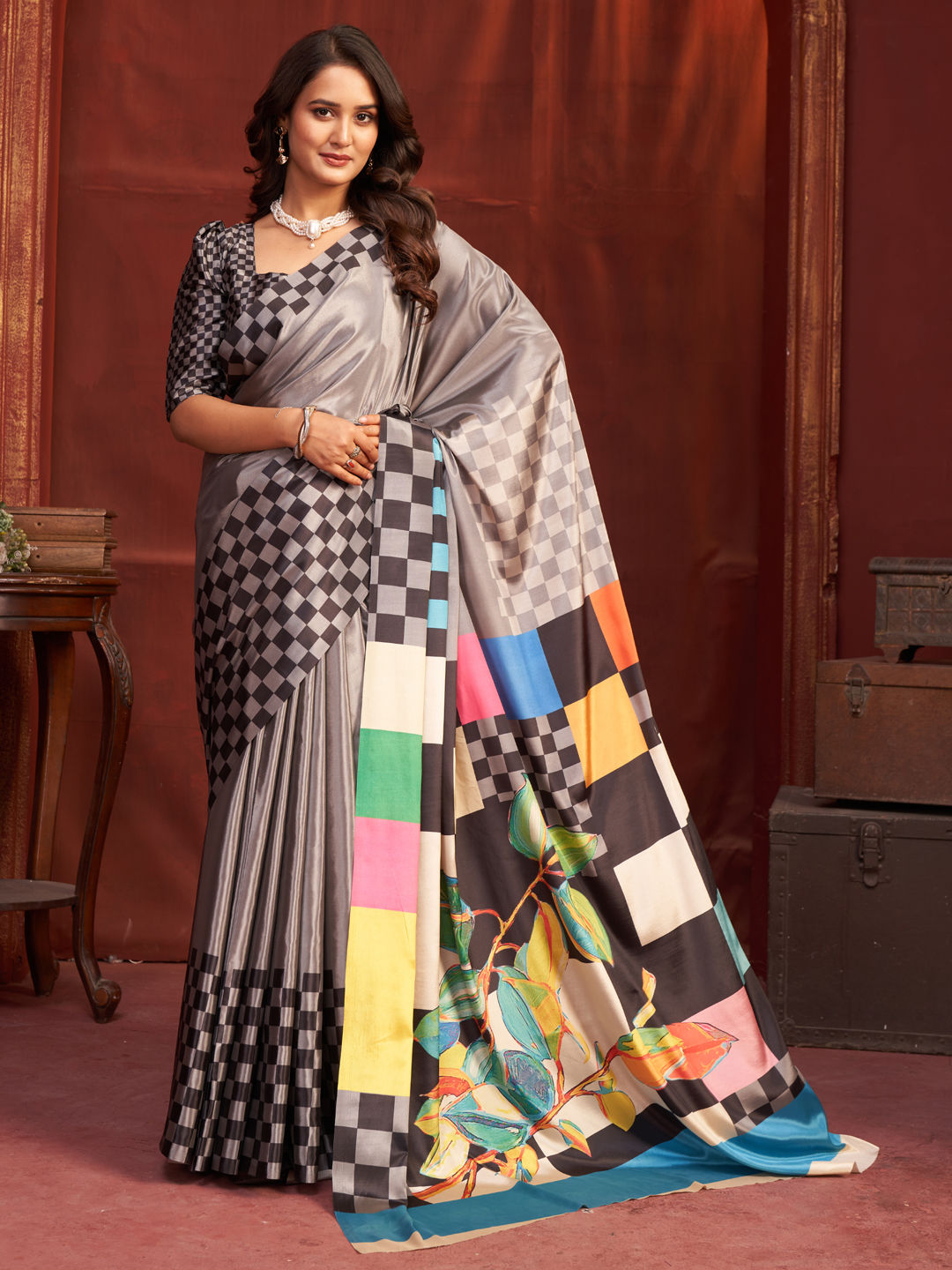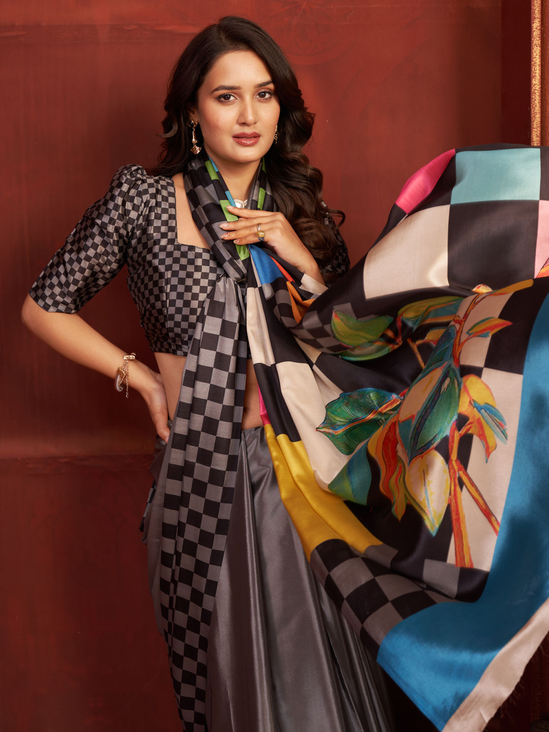 Crepe Silk Festive Saree in Black and Grey with Digital Print work