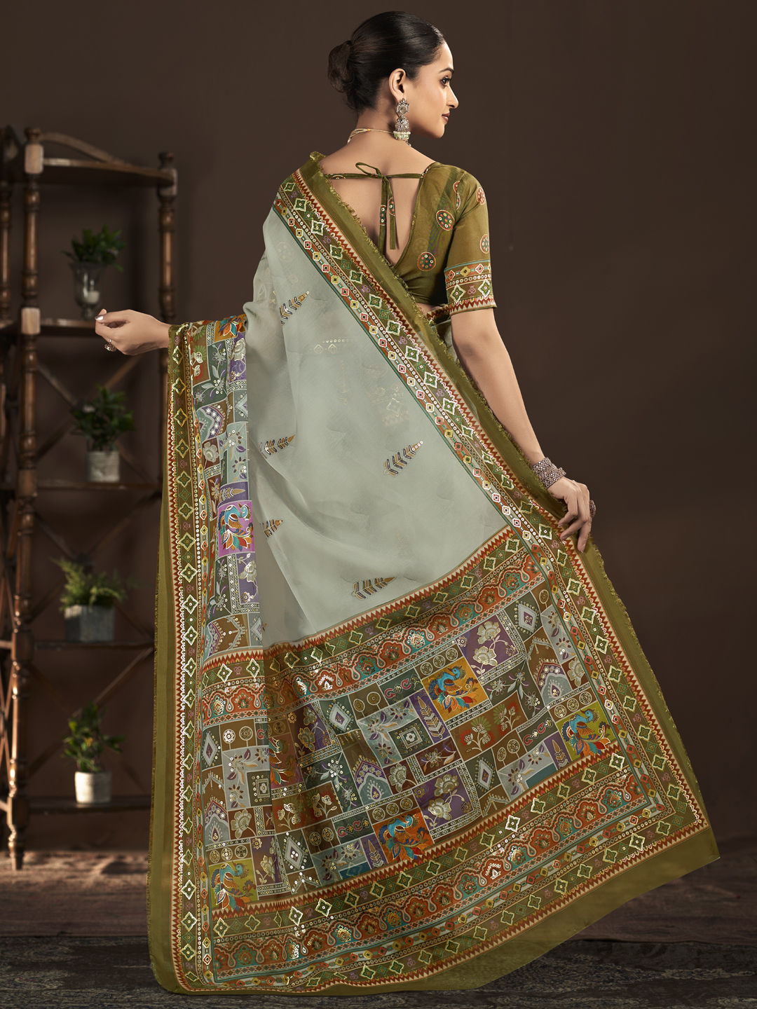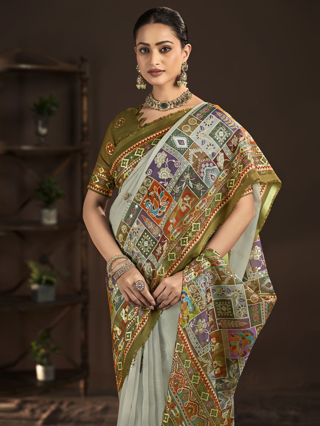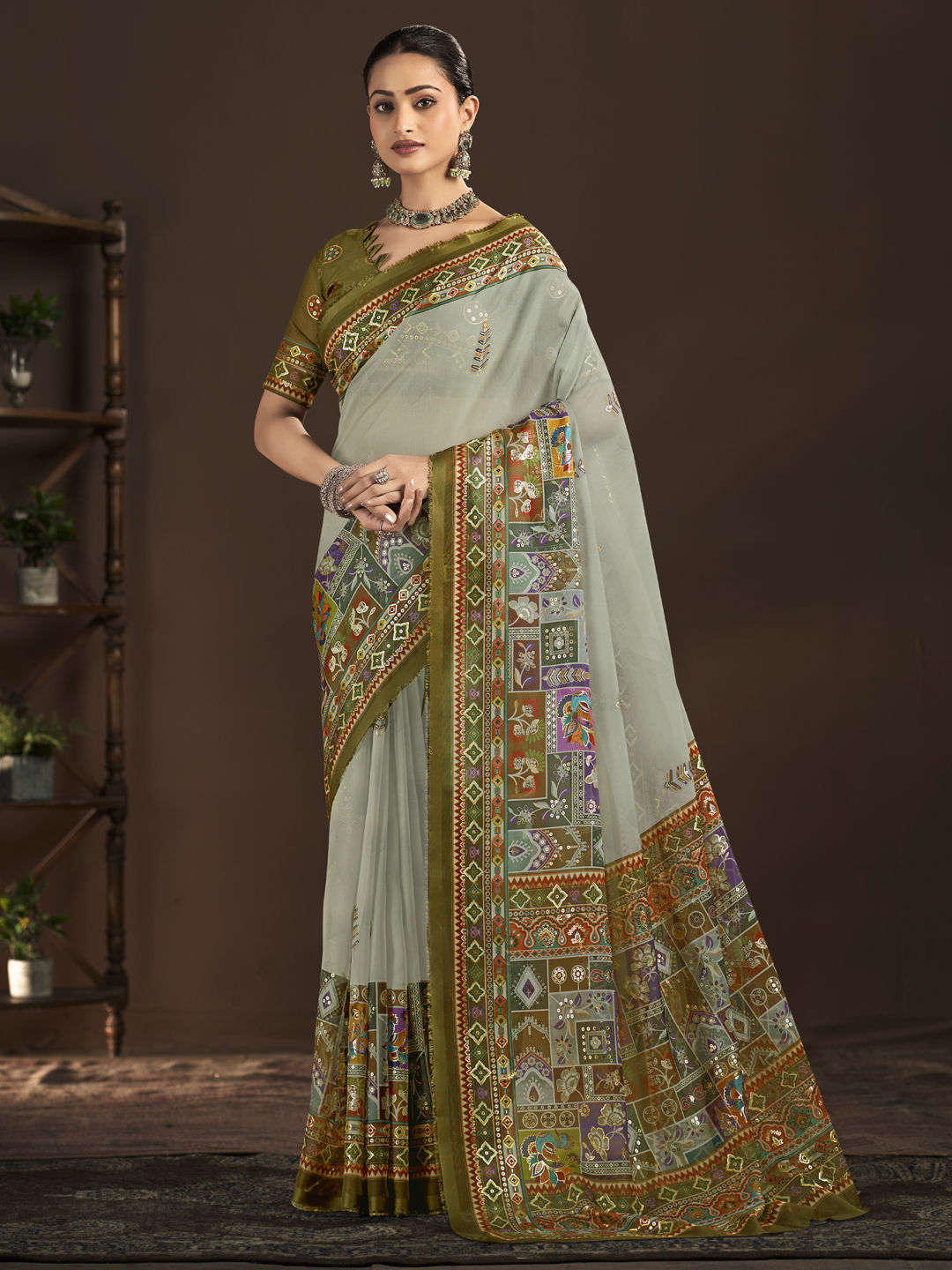 Green color Saree in Crepe Silk fabric with Digital Print, Foil Print work