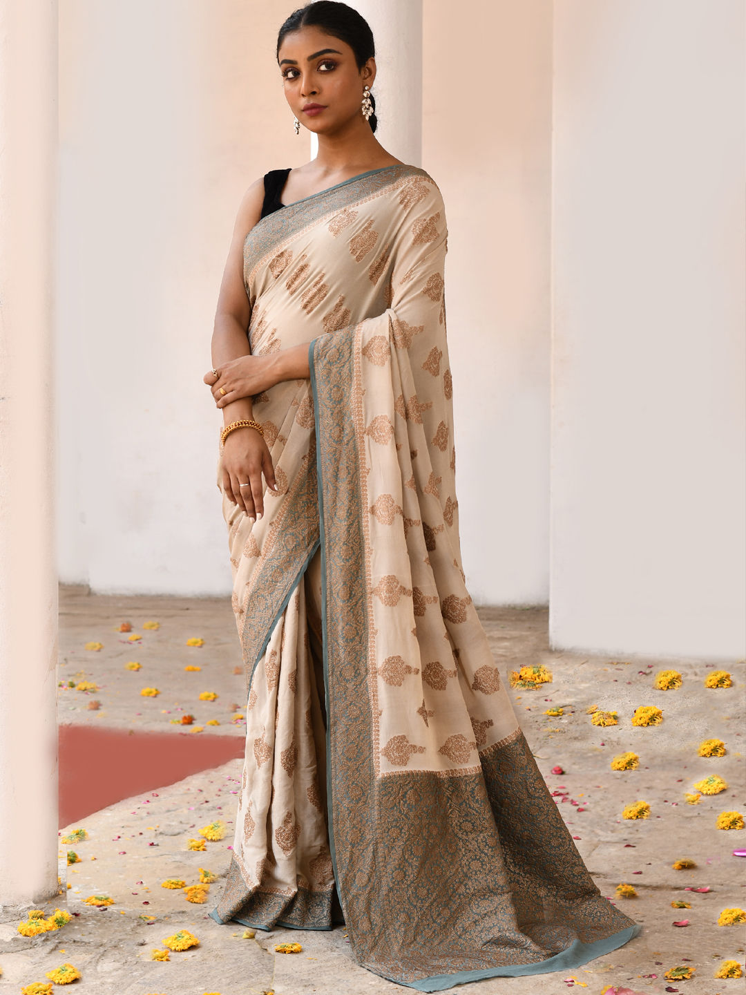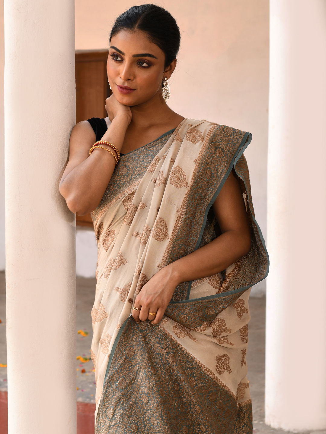 Beige and Brown color Saree in Chiffon, Crepe Silk fabric with Border, Zari work