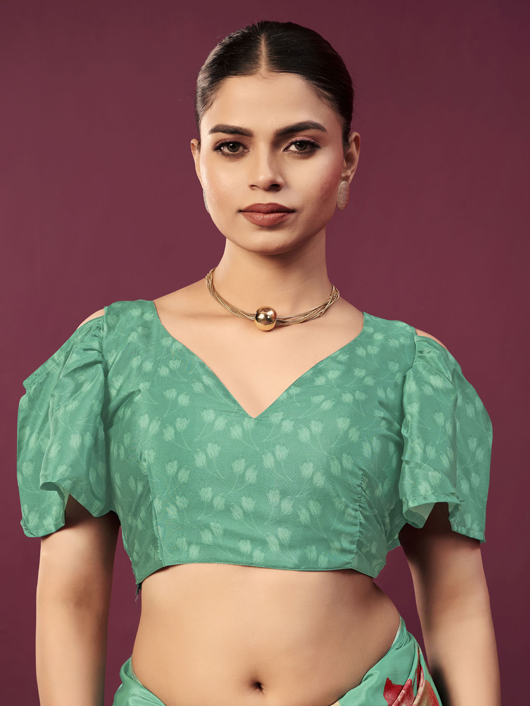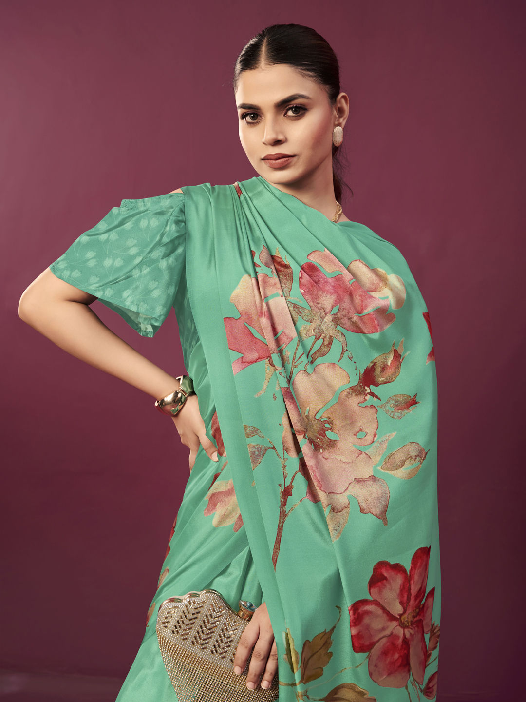 Green color Saree in Crepe Silk fabric with Digital Print, Floral work