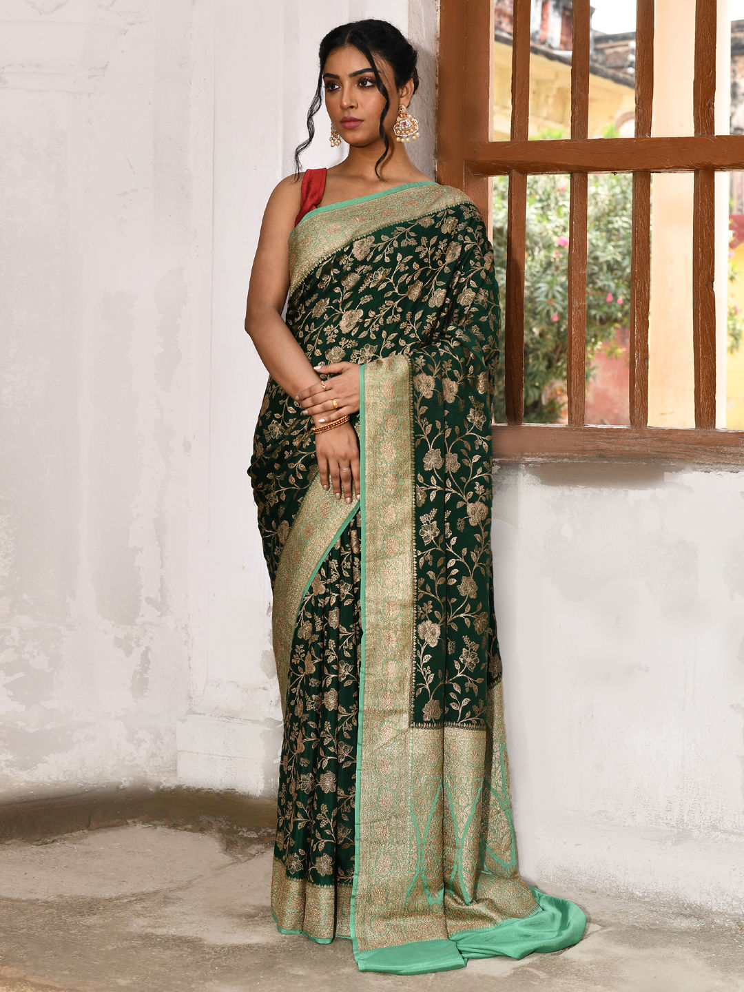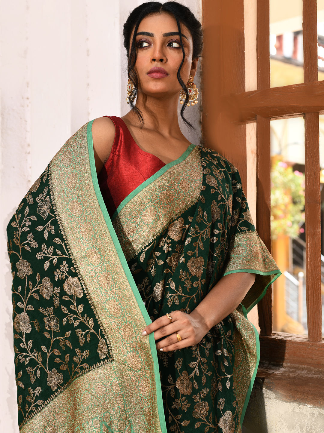Green color Saree in Chiffon, Crepe Silk fabric with Border, Zari work