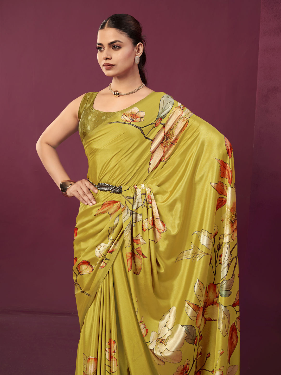Yellow color Saree in Crepe Silk fabric with Digital Print, Floral work