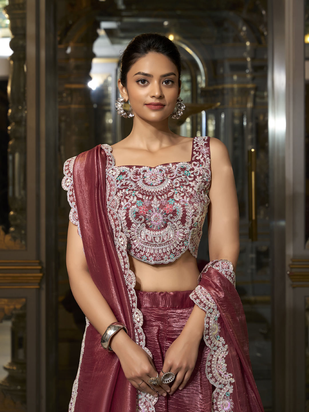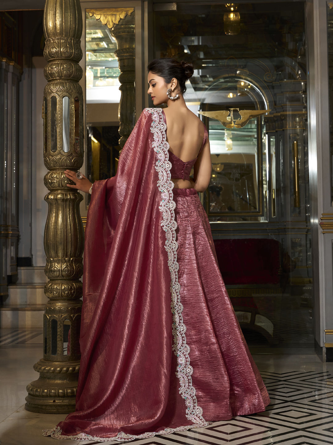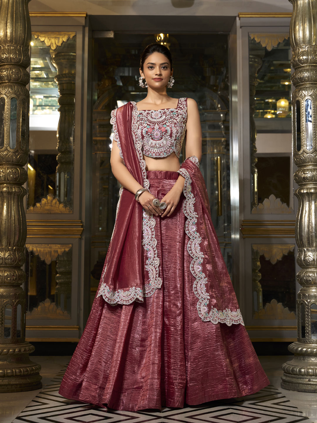 Crushed Silk Bridal Lehenga in Beige and Brown with Embroidered work