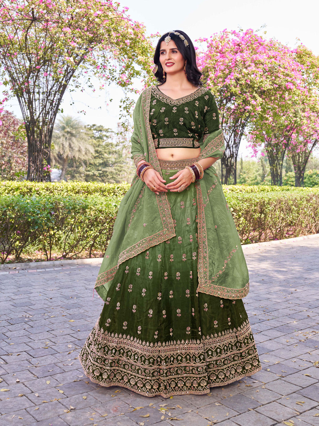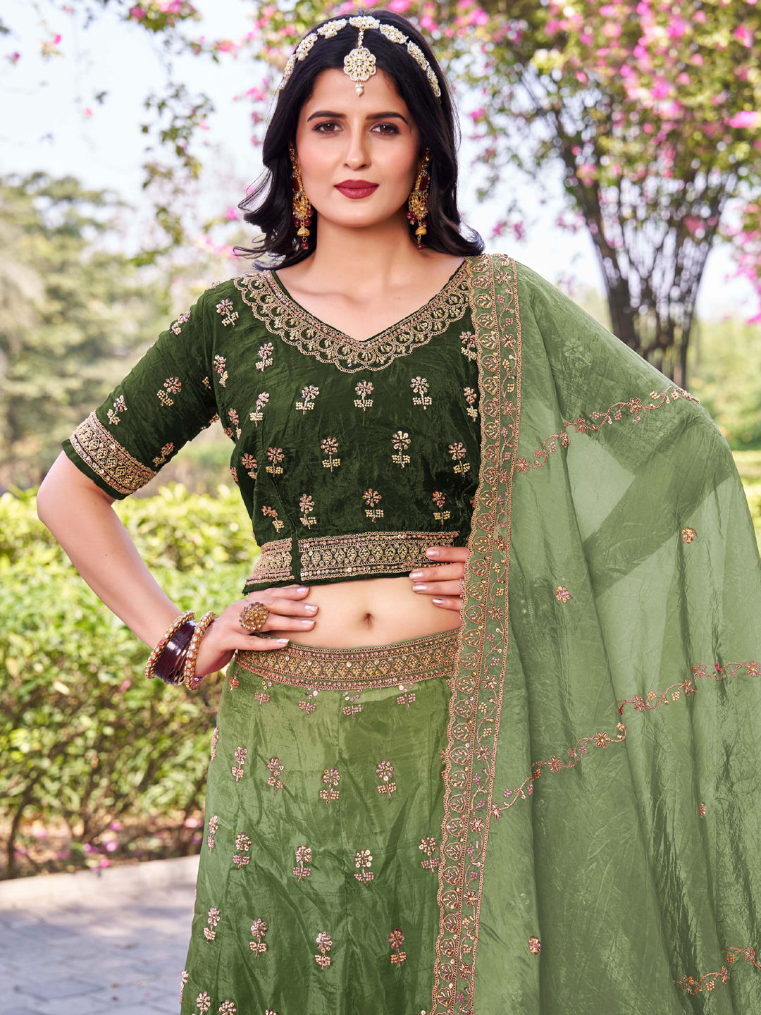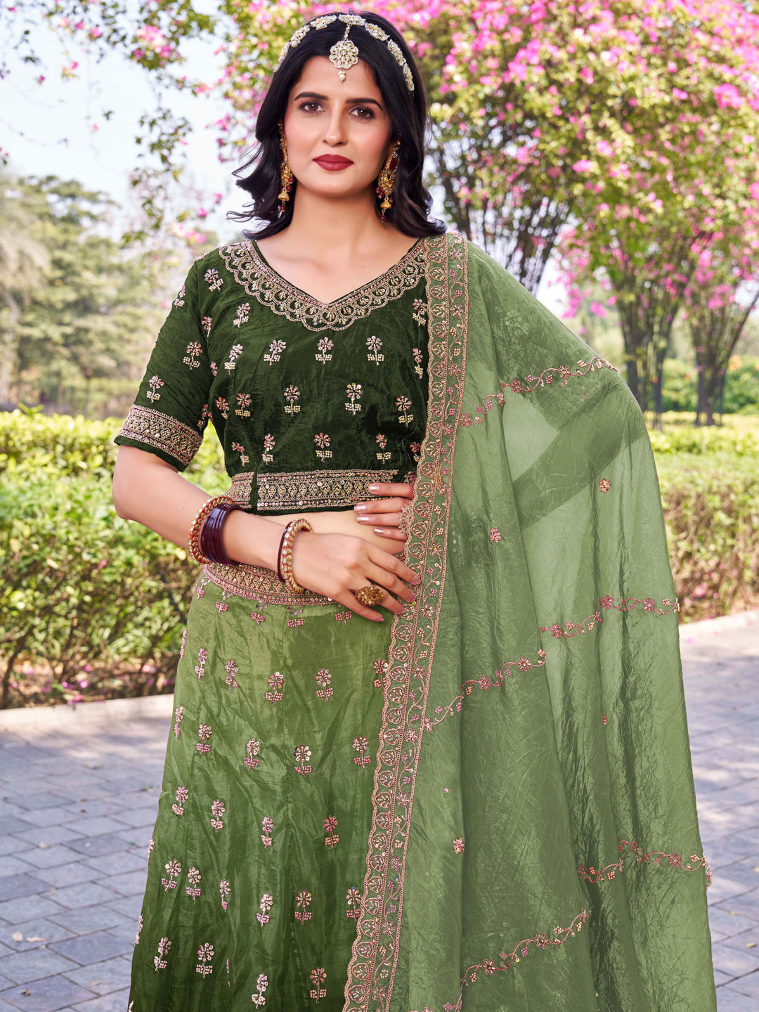 Crushed Silk Wedding Lehenga in Green with Thread work