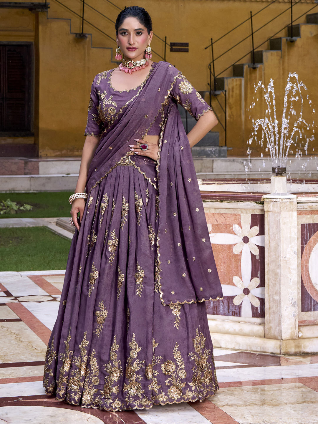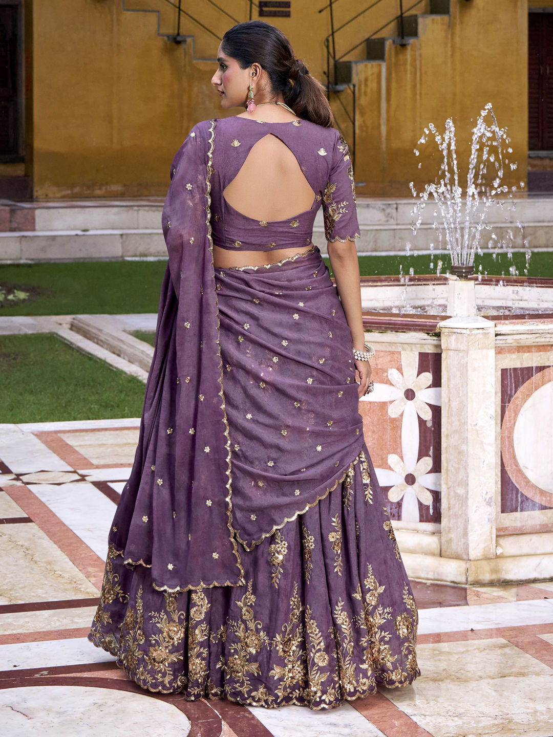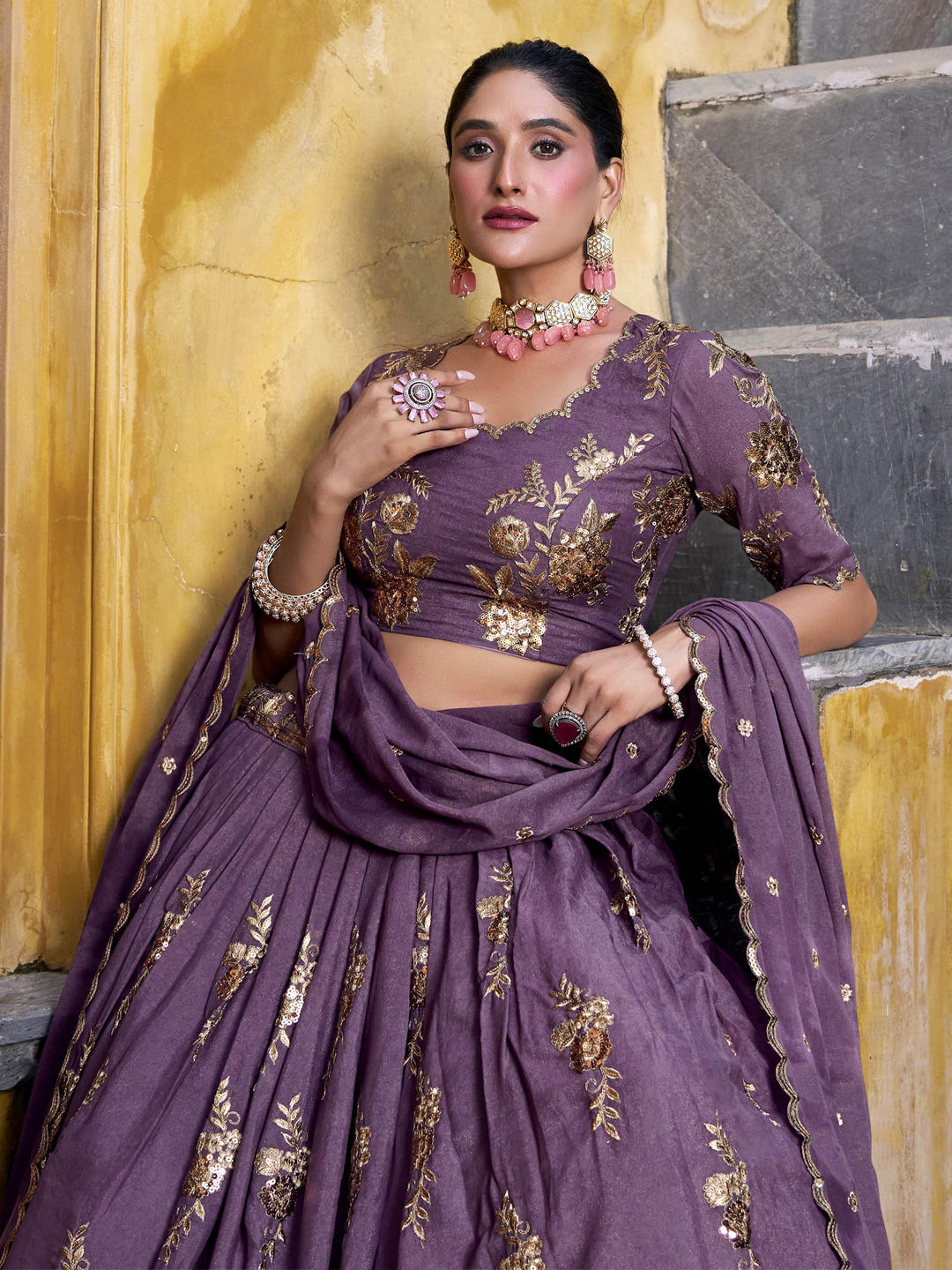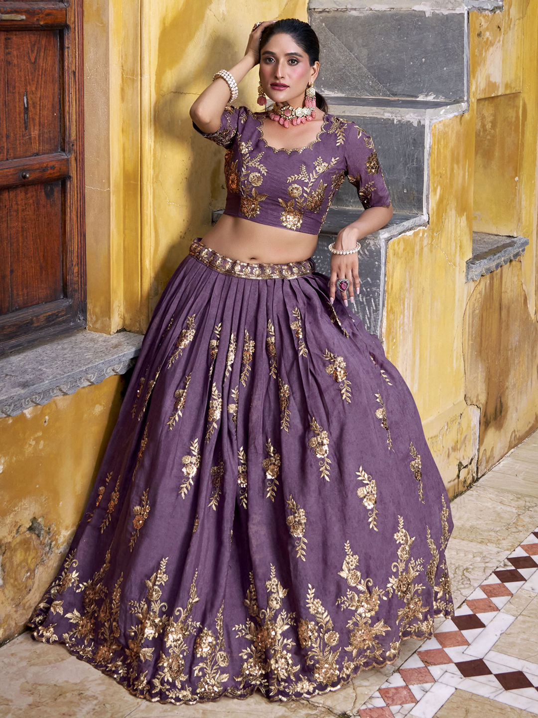 Purple and Violet color Lehenga in Crushed Silk fabric with Embroidered, Sequence, Thread work