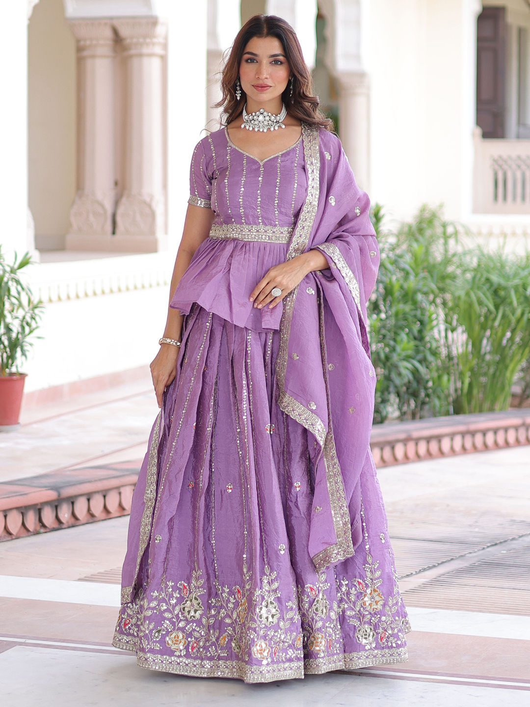 Purple and Violet color Long Lehenga Choli in Crushed Silk fabric with Embroidered, Sequence, Thread, Zari work